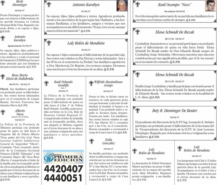 Fúnebres del miércoles 5 de abril de 2017