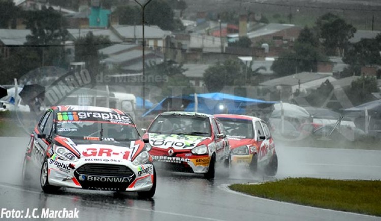 El diluvio no frenó al Turismo Nacional en el autódromo Rosamonte de Posadas. La jornada sabatina entregó la clasificación definitiva para la Clase 2 y posteriormente abrió la pista para tres emocionantes series que alimentaron la pasión del público misionero que, a pesar del agua, se mostró en buen número detrás del alambrado.Alejandro Bucci (Kinetic), Ariel Michieletto (208) y Yamil Apud (Corsa) fueron los ganadores de series muy parejas, en la que el manejo se hizo muy complicado por la escasa visibilidad que generaba la lluvia.El piloto misionero, Juan Pablo Koch, largó cuarto en la serie iniciarl y logró avanzar una posición para terminar tercero, detrá de Jorge Vitar (Clio).El volante de Alem sacó a escena su manejo en estas condiciones y estuvo muy cerca de dar el salto al segundo puesto, pero en la maniobnra de sobrepaso Vitar cuidó bien la línea y todo terminó sin variantes.En los giros finales Koch tuvo que soportar la presión de López Doncelli, quien mostró buen ritmo en el desenlace y terminó cuarto.Este domingo a las 12:30 se pondrá en marcha la tercera final del año, en la que Yamil Apud partirá primero, compartiendo la fila de punta con Bucci.Juampy largará octavo y buscará darle continuidad a su avance en el clasificador final.El espectáculo está asegurado, con 36 máquinas en la grilla de partida en esta nueva competencia.