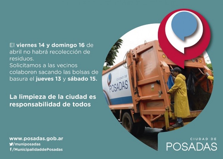 La Municipalidad de Posadas informó que este viernes 14 y el domingo 16 de abril, los camiones recolectores no trabajarán por las fiestas religiosas de Semana Santa. Por eso solicitan que la comunidad sea prudente y no saque las bolsas de basura afuera, para que no se formen basurales o terminen siendo desparramada la basura por los animales que andan sueltos.