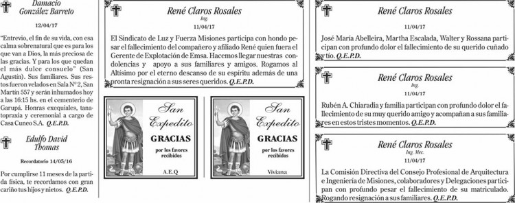 Fúnebres del jueves 13 de abril de 2017