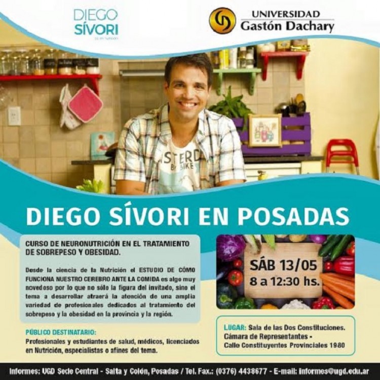 La Universidad Gastón Dachary (UGD) abrió las inscripciones para el curso que dictará en Posadas el reconocido licenciado en nutrición Diego Sívori, quien disertará sobre Neuronutrición bajo el título "Tratamiento del Sobrepeso y Obesidad". La cita está prevista para el sábado 13 de mayo, de 8:30 a 12:30, en la Sala de las Dos Constituciones de la Cámara de Representantes de Misiones, La disertación está destinada a profesionales y estudiantes de la salud, médicos, licenciados en Nutrición, especialistas y afines al tema.Sívori formó parte del ciclo televisivo "Cuestión de Peso", emitido por Canal 13 de Buenos Aires, durante los ciclos 2011, 2012, 2013 y 2014, y actualmente está en el programa "Cocineros Argentinos" de la TV pública. Ha trabajado además con deportistas de primer nivel, entre ellos los tenistas argentinos David Nalbandian y Guillermo Cañas, y se ha desempeñado en importantes instituciones deportivas como la Unión de Rugby de Buenos Aires (Urba) y el club Gimnasia y Esgrima de Buenos AiresPara informes e inscripciones, los interesados pueden dirigirse a la sede central de la UGD en Posadas (calles Colón y Salta), llamar al teléfono (0376) 4438677 o por correo electrónico a [email protected]