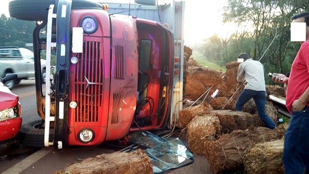 Según los primeros datos, la Seccional Primera de Artistóbulo del Valle tomó conocimiento de un accidente en el kilómetro 931 de la ruta nacional 14, en inmediaciones de la rotonda de la Avenida Paraguay de esta localidad.Una vez notificados, efectivos policiales acudieron al lugar y constataron que por causas que se tratan de establecer un camión Mercedes Benz, modelo 1114, que circulaba sentido Salto Encantado-Aristóbulo, se cruzó de carril, colisionó contra un Fiat Uno y terminó volcando sobre el asfalto.La maniobra realizada por el chofer del rodado mayor habría sido para evitar chocar a una persona que trasponía la calzada.El camión, cargado con unos siete mil fardos de tabaco, era conducido por César L. (45), y lo acompañaban Marcio P. (28) y Adelio P. (55), procedentes de El Soberbio; mientras que el rodado menor era conducido por Viviana S. (40), quien fue trasladada al hospital local donde fue examinada por el médico de turno, quien diagnosticó que la mujer presentaba lesiones de carácter leve.Tanto el conductor del camión como sus acompañantes presentan escoriaciones leves.