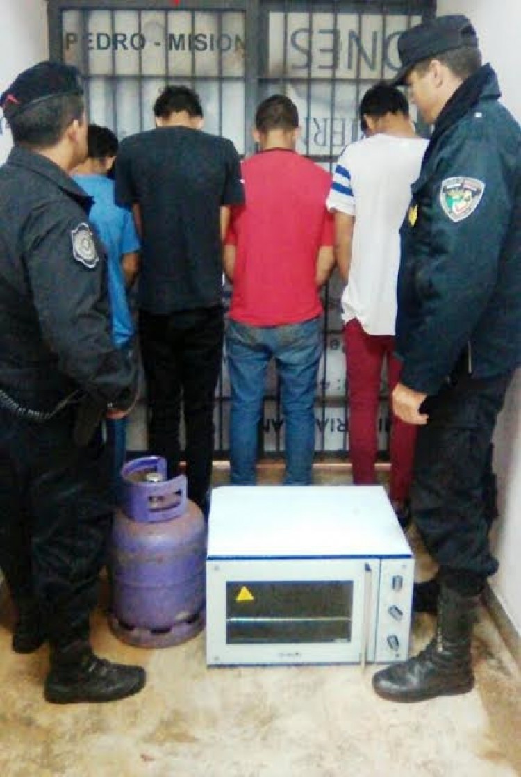 Ramón S. (21), Nicolás R.D. y dos menores de 16 y 17 años fueron detenidos el sábado por la noche por los efectivos de la división Comando Radioeléctrico de San Pedro, en el marco de una investigación por robos, entre ellos uno cometido en la madrugada del pasado 16 de abril en la casa de José A. (44), vecino del barrio Ana María Mogas.Además de las detenciones, los uniformados recuperaron un horno eléctrico y una garrafa de 10 kilos, elementos que fueron devueltos por la mamá de uno de los detenidos.Instruye el sumario por este hecho la comisaría Primera de San Pedro.