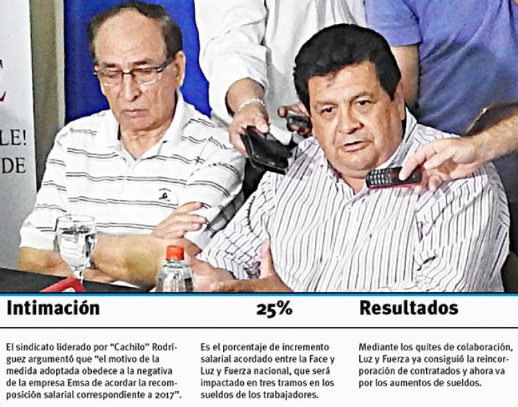 Con el objetivo de presionar para que la empresa Emsa implemente los aumentos salariales a los trabajadores, el gremio de Luz y Fuerza decidió empezar un quite de colaboración a partir de ayer y hasta tanto se resuelva la situación. La intimación se realizó mediante una nota firmada por el secretario general, Julio “Cachilo” Rodríguez y el secretario gremial, José Reineck, en la que expresa la decisión de Luz y Fuerza de iniciar “el quite de colaboración y estricto trabajo a reglamento, a partir de las 13” de ayer. Luego de conocer que la Federación Luz y Fuerza (FATLyF) firmó el Acta – Acuerdo con la Federación Argentina de Cooperativas Eléctricas (Face), que otorga un aumento del 25% para todos los afiliados a Luz y Fuerza y que tendrá vigencia con retroactivo desde marzo y hasta febrero del año que viene. El primer tramo del incremento será del 12% para el período comprendido entre marzo y mayo. Mientras que el segundo será del 7% no acumulativo y vigente a partir del 1 de junio y hasta de agosto. En tanto, el tercero y último tramo alcanza el 6%, también no acumulativo, que se aplicará de septiembre a febrero del año próximo.Asimismo, Face y FATLyF resolvieron efectuar una revisión del acuerdo en diciembre, para analizar la evolución del Índice de Precios al Consumidor que publique el Indec para el período comprendido en el acuerdo y realizar los ajustes que pudieran corresponder. La medida tomada por el gremio liderado por “Cachilo” afectará todos los servicios que realizan los empleados, sirviendo sólo guardias mínimas y según la misiva comprende a todos los trabajadores dependientes de Emsa, afiliados a esa entidad gremial. Es la segunda vez en menos de sesenta días que el gremio intima por escrito a Sergio “Piti” Ferreyra por mejoras salariales, siendo la primera vez a través de la Federación nacional argumentando que los sueldos de los empleados estuvieron congelados durante todo el año pasado. “El motivo de la medida adoptada obedece a la negativa de esa empresa de acordar la recomposición salarial correspondiente a 2017”, señala la documental presentada por el gremio comandado por “Cachilo” Rodríguez. En la misma asegura que se agotaron las instancias de diálogo “a pesar de todos los esfuerzos realizados desde la entidad gremial”. Luz y Fuerza advierte que de no obtener una respuesta satisfactoria, se adoptarán otras medidas desde hoy.