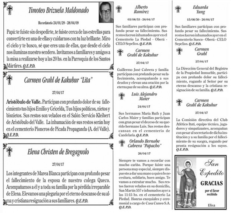 Fúnebres del viernes 28 de abril de 2017