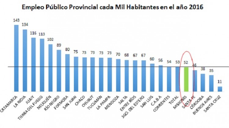 Según un informe de la consultora Economía y Regiones (E&R), en Argentina la recaudación propia de las provincias no alcanza para pagar sus sueldos. Si se suman los montos de la coparticipación que las provincias reciben, usan más de la mitad de todos sus recursos solo para abonar los salarios de empleados estatales. La única excepción es la Ciudad Autónoma de Buenos Aires a la cual le alcanza solo con su recaudación para pagar salarios.Dentro del listado, Misiones se encuentra en un punto intermedio. En la provincia el 48,9% de todos los ingresos se destina a sueldos. Solo con la recaudación propia no es suficiente ya que se necesita 221% de la recaudación propia solo para abonar los salarios. Por ello la provincia necesita multiplicar su recaudación por 4,5 veces para poder cubrir el importe de la masa salarial sin depender del Estado nacional.Más complicadas se encuentran las provincias de Formosa que necesita multiplicar por siete (771%) su recaudación para cumplir a fin de mes con los sueldos de los empleados provinciales. Y en condiciones similares se encuentran La Rioja, Jujuy, Catamarca y Chaco.Cuando se incorporan los fondos de la coparticipación, las provincias gastan, en promedio el 55,9% de sus ingresos totales en solventar el empleo público, llegando al extremo de Tierra del Fuego, donde el 67% del ingreso total se va en pagar salarios públicos, de acuerdo al informe de la consultora económica.En tanto que San Luis solamente usa un 31,8% del ingreso total para pagar salarios y tiene un margen más amplio para aplicarlo a inversiones, por ejemplo, a obras públicas.Federico Cuba, analista fiscal de Economía y Regiones, comentó que “el peso del gasto en personal de las provincias es alto. Se fue incrementando en los últimos años hasta duplicarse en términos del PBI (Producto Bruto Interno) en los últimos ocho años”. Además, Cuba agrega que el Nordeste Argentino “tiene una carga de empleo público bastante alta, lo mismo que Santa Cruz. Allí el gasto en personal tiende a ser mayor”. Recordando que el año pasado el Nordeste y la Patagonia fueron las regiones con mayores caídas interanuales en los puestos de trabajo privados registrados, lo que llevó a las provincias de esas regiones a tratar de compensar la caída con el empleo público. Al respecto de esta problemática, en su discurso de apertura de las sesiones ordinarias de la Legislatura, el 1º de mayo, el gobernador de Misiones, Hugo Passalacqua mencionó que la provincia recibió menos dinero que el presupuestado en concepto de coparticipación por todo el año 2016 y los primeros cuatro meses de 2017.Passalacqua consideró crítica la caída de la coparticipación detallando que Misiones recibió 162 millones de pesos menos que lo presupuestado por el año 2016, y en los primeros cuatros meses del 2017 fueron 152 millones. Lo que hace un total de 314 millones de pesos menos que lo establecido en los presupuestos.Según otro informe económico, Misiones se ubica entre las cinco provincias con menor cantidad de empleados públicos del país, alcanzando solo 49 empleados cada mil habitantes. Esto que se conoció por datos oficiales, también fue mencionado por Passalacqua el 1 de mayo. <p lang="es" dir="ltr"><a href="https://twitter.com/hashtag/GastoP%C3%BAblico?src=hash">#GastoPúblico</a>Más de la mitad de los ingresos de Misiones se van en el pago de sueldos <a href="https://t.co/I9rWyBd1Ef">https://t.co/I9rWyBd1Ef</a> <a href="https://t.co/Rn5CfOi6Lr">pic.twitter.com/Rn5CfOi6Lr</a></p>— Primera Edición (@primeraedicionw) <a href="https://twitter.com/primeraedicionw/status/860219810562662400">May 4, 2017</a>