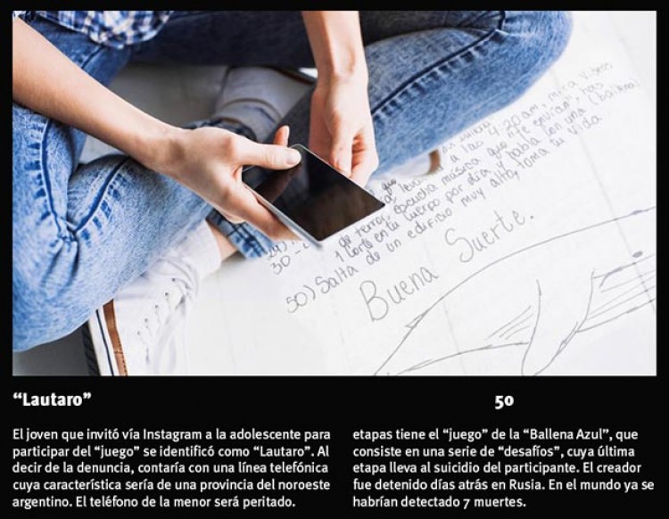Los peligros de la “Ballena Azul”, el “juego” que circula a través de las redes sociales y que causa conmoción en el mundo en razón de las vidas adolescentes que se cobró, aparentemente desembarcó en Misiones. Al menos eso es lo que denunció el padre de una adolescente de 14 años domiciliada en Posadas, quien aseguró ante las autoridades que su hija fue víctima de tal cuestión.Según pudo saber PRIMERA?EDICIÓN, la denuncia fue radicada el pasado 18 de abril ante la Comisaría de la Mujer de la Unidad Regional I, en el centro posadeño. Sin embargo, no fue hasta las últimas horas que trascendió a la opinión pública.En ese documento, el hombre reconstruyó parte del relato que le hizo su propia hija. La menor contó que días antes de la denuncia fue contactada a través de la red social Instagram por un joven que se identificó como “Lautaro”, quien aparentemente la invitó a participar de un grupo de Whatsapp en el que se desarrollaba el polémico “juego” de la “Ballena Azul”. Al parecer, el presunto instigador había contactado a su víctima después de que la misma descargara una aplicación. Ese detalle aún no está del todo claro.Lo cierto es que después de que la joven fue agregada a ese grupo, “Lautaro” comenzó a comunicarse por mensajes privados con la menor. Allí, al parecer a través de audios, le dijo que ella le caía bien y que por ello le iba a contar la verdad detrás del grupo.?Aseguró entonces que se trataba del “juego” en cuestión, pero le dijo que, debido a que había hecho “buenas migas” con ella, no la iba a dejar continuar o al menos iba a tratar de convencerla para que no siguiera con las etapas presentadas, que tienen como último “desafío” el suicidio del participante.Sin embargo, no fueron todos mensajes de afecto. Enseguida “Lautaro” -quien aparentemente tenía un número telefónico con característica que sería de una provincia del Noroeste argentino- le dijo que si llegaba a contar a alguien sobre sus mensajes -serían de audio-, iba a secuestrarla, lisa y llanamente.Ante tal situación, el padre radicó formal denuncia. La investigación recayó en el magistrado Ricardo Balor, titular del Juzgado de Instrucción 6 de la capital provincial, quien ordenó una serie de medidas, entre las cuales se cuentan el secuestro del teléfono celular de la adolescente para la realización de pericias. El juez a cargo del caso debe establecer además si la competencia corresponde a la Justicia ordinaria o si, por el contrario, la causa debe ser investigada por la Justicia Federal.