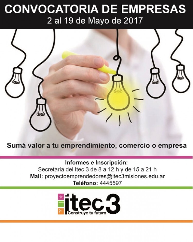 El proyecto incluye el asesoramiento y desarrollo de propuestas innovadoras y estrategias empresariales para sumar valor a emprendimientos locales. Cabe resaltar que la participación de las empresas participantes es sin costo alguno, ya que las propuestas serán desarrolladas por los alumnos que están finalizando su formación académica y para los que el Itec N°3 busca que realicen prácticas con casos reales, con contextos y limitaciones reales, y dentro del marco académico, con el seguimiento y control de los equipos docentes de la institución.La iniciativa cuenta con el apoyo de la Intendencia de Garupá, del Consejo Deliberante de Garupá, de la Oficina de Empleo del Municipio y del área de Desarrollo Económico también de Garupá, por considerar valioso el aporte para el crecimiento y fortalecimiento de los diferentes actores empresariales y comerciales de la región.La convocatoria para todos aquellos interesados está abierta hasta el 19 de mayo del corriente año y deberán registrar su solicitud en la Secretaría del Itec N°3 de Garupá de 8 a 12 h y de 15 a 21 h, por mail a [email protected], en el <a href="http://www.itec3misiones.edu.ar/">sitio web del Itec 3</a> o bien realizar consultas al teléfono 4445597.