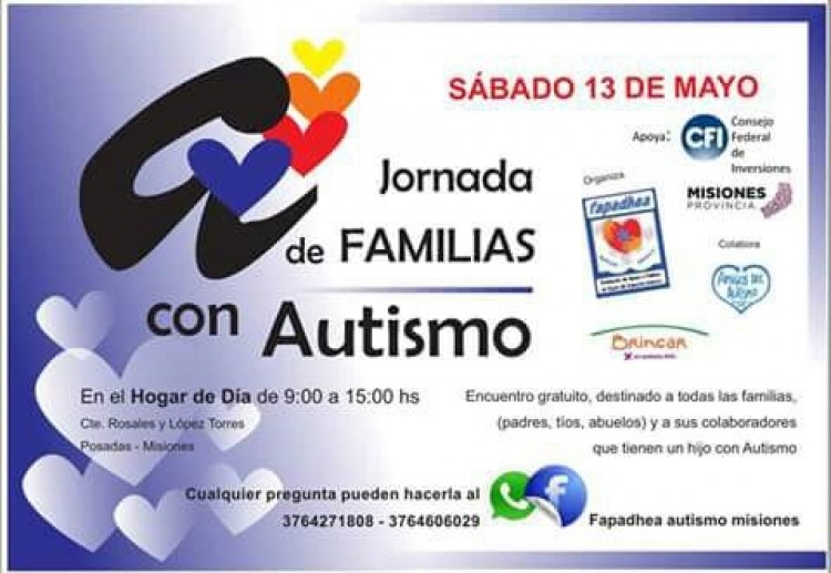 El encuentro es gratuito y está destinado a todas las familias (padres, tíos, abuelos, y a sus colaboradores que tienen un hijo con autismo.Para mayor información, pueden comunicarse al (0376) 154271808 o al (0376) 154606029. Organiza la Fundación Apoyo de Padres de Hijos del Espectro Autista (Fapadhea)