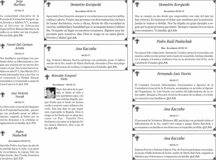Fúnebres del martes 9 de mayo de 2017
