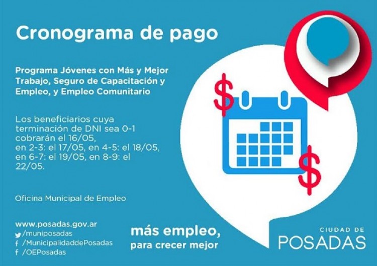 La Oficina Municipal de Empleo de Posadas comunica que a partir del próximo martes 16 de mayo comienza el pago de los programas Jóvenes con Más y Mejor Trabajo, Seguro de Capacitación y Empleo y Programa de Empleo Comunitario. Los beneficiarios cuya terminación de DNI sea 0-1cobrarán el  16/05, los terminados en 2-3, el  17/05, los finalizados en 4-5 el 18/05, en 6-7 cobrarán el 19/05, mientras que los terminados en 8-9 tendrán acreditado el monto de la beca el 22/05. La Oficina Municipal de Empleo aclara que los nuevos beneficiarios interesados en retirar sus tarjetas deben asistir al Anexo del Banco Nación (por calles San Martín y Ayacucho), personalmente y con DNI, el día que le corresponde por terminación del DNI. De no poder asistir el día correspondiente a la terminación de su documento, deberá hacerlo después del 23 de mayo.