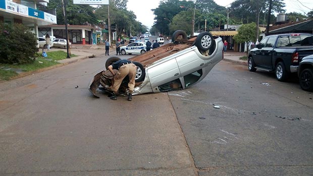 Por causas que se tratan de establecer un automóvil Renault Logan (remís) que circulaba hacia el centro conducido por Javier M. (30), colisionó contra otro Logan y luego con otros vehículos estacionados en la citada avenida. Finalmente el remís volcó y quedó en posición invertida. No se registraron lesionados. Trabajaron en el lugar los efectivos de la Seccional 16ª y peritos de la Policía Científica.Fotos: Gentileza Bomberos TUM Garupá