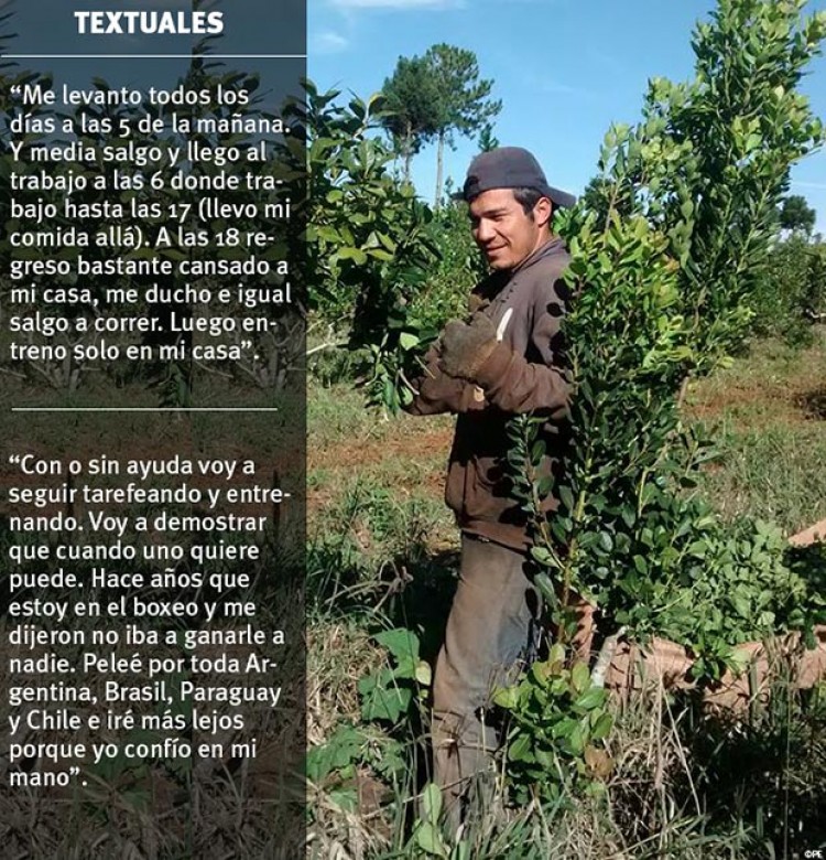 Supo estar en los principales rings del país y demostrar sus condiciones en el exterior, combatir con los mejores de su categoría y ganar importantes peleas. Pero hoy la vida le dio un duro golpe al boxeador misionero, Juan Carlos Pedrozo, que por cuestiones económicas se volcó a la tarefa para mantenerse y comprar los elementos que necesita para seguir practicando el deporte que ama.En una charla con DE?PRIMERA, el púgil de San Pedro explicó lo sensible de su situación y de qué manera lo afecta en su pretensiones de seguir adelante.“Estoy tarefeando para comprar un guante que no tengo y en julio quiero volver a competir. También para poder comprar la comida y mantenerme. Ya que no tengo un sueldo fijo, así me gano la vida”, explicó el boxeador en un breve tiempo de descanso luego de llegar de tarefear en el campo.“Mano de Piedra”, como lo conocen en el ámbito pugilístico, desarrolló tres peleas en el año, logrando sendos nocauts ante Luis “Potro” Abregú y el brasileño Gilson Gois da Silva, mientras que en su último pleito cayó con el número uno del ranking argentino, el bonaerense Jonathan Eduardo Gastón Chávez, ex monarca latino superligero OMB.Justamente la caída en este último combate fue lo que desató todos los problemas para el misionero. “Antes mi entrenador me brindaba alojamiento, comida y un gimnasio para entrenar y por eso vivía en Corrientes”, aclaró Pedrozo, resaltando que “también tarefeaba ahí”. “La idea era ganar e ir a Alemania, pero perdí y cambió todo”, se lamentó el púgil, que pese al duro golpe que recibió mantiene sus esperanzas intactas y asegura que “no le tengo miedo a ningún trabajo si es para comprar lo que necesito para seguir”.Para cerrar, humildemente, Pedrozo dijo: “No pido plata ni nada de eso, pero me gustaría tener algún respaldo ya que en julio voy a pelear en la provincia por TyC Sport. Quiero demostrar que Misiones también puede llegar a lo más alto”.