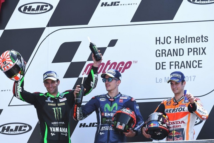 El piloto español Maverick Viñales (Yamaha) ganó el Gran Premio de Francia de MotoGP, este domingo en Le Mans, por delante del francés Johann Zarco (Yamaha Tech3), que logró su primer podio, y de su compatriota Dani Pedrosa (Honda).Con este triunfo Viñales se convierte en el nuevo líder del Mundial, en detrimento de su compañero de equipo, el legendario italiano Valentino Rossi, que se fue al suelo al intentar alcanzar al español en la última vuelta.El triunfo en Le Mans es el cuarto en la carrera de Viñales en MotoGP, el tercero de esta temporada.Zarco, con una Yamaha satélite y neumáticos blandos, completo una excelente salida y se hizo con el primer puesto, que defendió durante cinco vueltas, antes de cederlo a Viñales y luego a Rossi, por lo que fue capaz de pelear con las Yamahas oficiales.Su tercer puesto fue el primer podio de un francés en la categoría reian desde que Randy de Puniet finalizara tercero en 2009 en el Gran Premio de Gran Bretaña.El cuarto puesto fue para el italiano Andrea Dovizioso (Ducati), mientras que su compañero, el español Jorge Lorenzo (Ducati), fue sexto.El vigente campeón del mundo, el también español Marc Márquez (Honda), no pudo finalizar la carrera al sufrir una caída a ocho vueltas del final.Fuente: NA