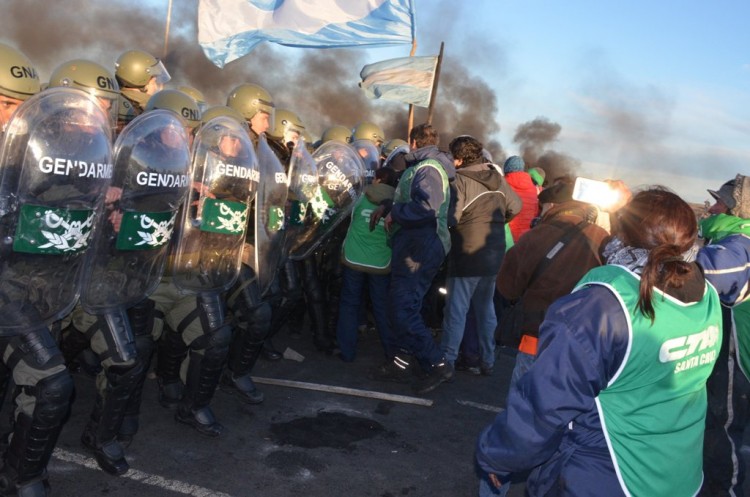 El desalojo, durante el cual también fue golpeado un periodista, fue ordenado por el juzgado federal de Río Gallegos, a cargo del juez subrogante Aldo Suárez, según informó el comandante mayor Escubilla, jefe de la agrupación de Gendarmería en la provincia patagónica, quien dijo que los manifestantes recibieron una notificación judicial que les ordenaba retirarse de la ruta, principal vínculo de la capital santacruceña con el norte del país.Los detenidos fueron dos dirigentes sindicales de la Asociación de Trabajadores del Estado (ATE), la titular de la seccional El Calafate Andrea Mayorga y Pablo Fariña de la comisión provincial, informó Alejandro Garzón, secretario general de ATE Santa Cruz, quien también resultó afectado por las gases.Además, el periodista Nicolás Revello fue golpeado por gendarmes, según testigos.<p lang="es" dir="ltr">AHORA gendarmería desaloja RN3 en <a href="https://twitter.com/hashtag/R%C3%ADoGallegos?src=hash">#RíoGallegos</a> <a href="https://twitter.com/hashtag/SantaCruz?src=hash">#SantaCruz</a>. Imagen de colega <a href="https://twitter.com/nicolasrevello">@nicolasrevello</a> <a href="https://t.co/F8zZXruskc">pic.twitter.com/F8zZXruskc</a></p>— Sergio Villegas (@sergiovillegas7) <a href="https://twitter.com/sergiovillegas7/status/866388227678187524">21 de mayo de 2017</a>Dirigentes de la Mesa de Unidad Sindical (MUS) y de la CTA Autónoma se presentaron en el lugar "para resistir el desalojo" con ATE, que mantenía desde hacía más de diez días un corte en la ruta 3 exigiendo una salida a la crisis que atraviesa la provincia de Santa Cruz."Esta es la respuesta que tenemos después de 12 días, de parte del gobierno nacional", dijo a Télam Garzón, quien también reclamó que "el diputado (Eduardo) Costa que no hizo nada para detener esto".El dirigente expresó "al gobierno nacional y al gobierno provincial, ahora que ya están satisfechos, que han reprimido a los trabajadores del Estado, les exigimos respuestas para los problemas que tiene el pueblo santacruceño, que son demasiados, que vienen desde hace muchos años, que no son resueltos por la corrupción, por la falta de política, de sensibilidad"."Esto no va a ser en vano, ATE se declara en rebeldía, nos vamos a reagrupar para defender los intereses de los santacruceños y ya informaremos las medidas que vamos a llevar adelante", dijo mientras esperaba la ambulancia que lo trasladó hasta el hospital, afectado por el gas pimienta en los ojos.La MUS y CTA Autónoma, docentes y empleados públicos exigen el pago en tiempo y forma de salarios, y también paritarias, mientras que las asambleas ciudadanas en las que confluyen jubilados, padres y estudiantes reclaman la normalización en el dictado de clases y otros servicios paralizados, como la administración de justicia y la atención sanitaria.<p lang="es" dir="ltr">Rio Gallegos, Santa Cruz. Es tal la falta de gobierno de cfk/alicia kirchner,que ni siquiera salieron a decir algo por desalojo de la ruta. <a href="https://t.co/S2qvRo3weY">pic.twitter.com/S2qvRo3weY</a></p>— oscar muñoz (@munoznotired) <a href="https://twitter.com/munoznotired/status/866440390827802625">21 de mayo de 2017</a>Esas organizaciones preparan un Cabildo Abierto para el miércoles 24 de mayo a las 14 en la Casa de Gobierno, con la consigna de 1810 "el pueblo quiere saber", en referencia a las negociaciones que mantienen los gobiernos nacional y provincial, sin que hasta ahora se traduzcan en soluciones a la crisis santacruceña.Fuente: Télam