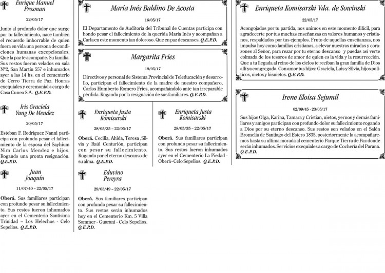 Fúnebres del miércoles 24 de mayo de 2017