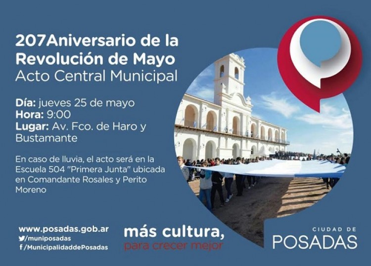 Este jueves 25 de mayo, a las 9 de la mañana, el intendente de Posadas, Joaquín Losada, presidirá el festejo por el 207º aniversario de la Revolución de Mayo.La ceremonia está prevista en sobre la avenida Francisco de Haro en su intersección con Bustamante.En caso de lluvia, se trasladará a las instalaciones de la Escuela 504 "Primera Junta", ubicada en Comandante Rosales y Perito Moreno.