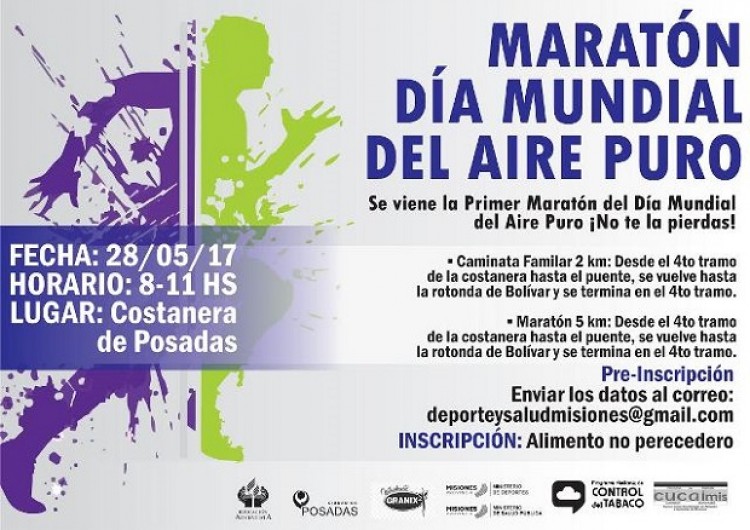 Las actividades se llevarán a cabo en el Marco del Día Mundial de la Donación de Órganos (30 de mayo) y el Día Mundial Sin Tabaco (31 de mayo).Cronograma de actividades El viernes 26 de mayo en el colegio Adventista Mariano Moreno (centro), donde se harán capacitaciones dirigidas a los alumnos sobre diferentes temas: adicciones, ambientes libres de humos y donación de órganos. El sábado 27, en simultáneo los hospitales Samic de Oberá y Eldorado realizarán actividades de sensibilización, actividades físicas y recreativas con la comunidad en la plaza principal de cada localidad.“Maratón por el Aire Puro en Posadas”El domingo 28 de mayo de 8 a 11 horas, en el cuarto tramo de la costanera, se llevará a cabo la “Maratón por el Aire Puro” de 5 km. y una caminata familiar de 2 km, la actividad está destinada a la comunidad en general y se pide que colaboren con un alimento no perecedero. Pre-inscripción: al correo: [email protected] .En tanto que el martes 30 se desarrollará una charla -taller en el Instituto Adventista Alta Gracia sobre prevención de adicciones (Avenida Santa Catalina y Suecia) destinada a los alumnos y docentes de la institución. En cuanto al Día Mundial de la donación de Órganos ( 30 de mayo) a las 8 horas en la Plaza 9 de Julio se realizara promoción sobre donación de órganos, con el acompañamiento del Programa Provincial de Salud Renal (PPSR) y el Centro de Producción y Divulgación en la Temática del Trasplante (CEPRODITx) de la carrera de Trabajo Social de la Facultad de Humanidades y Ciencias Sociales. 10:00 horas. Descubrimiento y bendición de placa de agradecimiento y reconocimiento a donantes de órganos 2016 en salón ecuménico Hospital Escuela de Agudos Dr. Ramón Madariaga. 10:30 hs. Promoción sobre donación de órganos en Hall de entrada del Hospital Escuela de Agudos Dr. Ramón Madariaga con el acompañamiento de la Dirección medica de la Municipalidad de Posadas y de la Asociación Misionera Compartir.Día Mundial Sin TabacoEl 31 de mayo, se conmemora el Día Mundial Sin Tabaco y en el salón auditorio Dr. Ramón Carrillo del Ministerio de Salud Pública se realizará la entrega de certificados a instituciones, comercios y organismos que se adhirieron a los espacios libres de humos y después habrá una charla abierta denominada “Dejar de Fumar se Puede” para pacientes y comunidad en general. Organizada por el Área de Neumonología, el Consultorio de Cesación Tabáquica- Programa ECNT del Hospital Escuela, en conjunto con los programas de Control de Tabaco y Proteger del Ministerio de Salud Pública de Misiones.El 1 de junio para cerrar la semana se entregarán los alimentos no perecederos que se juntaron en la maratón a tres hogares convivenciales. Las actividad de la semana están organizadas por el Instituto Adventista Mariano Moreno, Instituto Adventista Alta Gracia, Gobierno Provincial: Ministerio de Salud Pública -a través de las Subsecretarias de Atención Primaria y Saneamiento Ambiental y de Prevención de Adicciones y Control de Drogas; los Hospital Escuela de Agudos Dr. Ramón Madariaga “Programa Cesación Tabáquica”, Cucaimis y los Hospitales Samic: de Oberá, Iguazú, Eldorado-, Ministerio de Deporte y Municipalidad de Posadas.