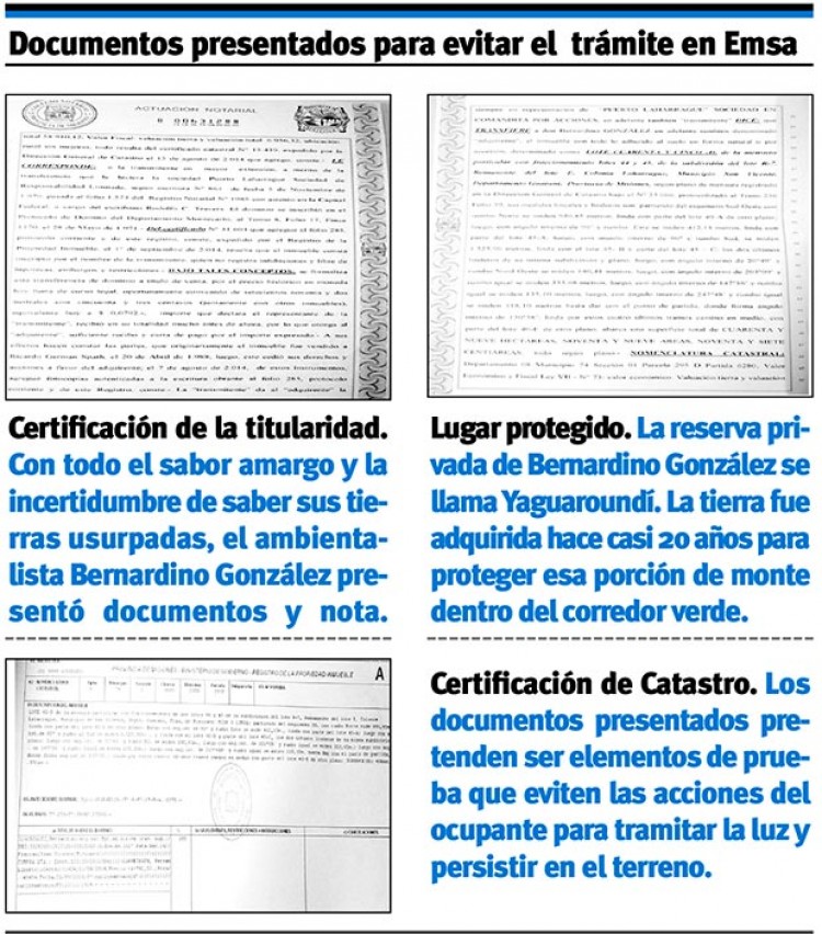 La desazón y la bronca se apoderó por estos días del ambientalista Bernardino González, quien posee una reserva privada con fines proteccionistas en San Pedro, no solo porque una porción del terreno está siendo ocupada ilegalmente sino porque se enteró que Emsa habría aceptado un pago de derechos de conexión de energía al supuesto intruso. “Se trata de un hombre que -tengo entendido- no es una persona pobre, pero aún así ocupó ilegalmente una parte de mi lote; le aceptan el trámite y el pago de los derechos de conexión, con el agravante de que ni siquiera vive en la provincia, el solo ocupa, alambra, y pone cuidadores”, dijo González a PRIMERA EDICIÓN luego de realizar una presentación ante la prestataria para evitar que los trámites sigan adelante.Contó el ambientalista “presenté en la empresa el título de propiedad, impuestos al día y plano de catastro, para certificar mi propiedad sobre el bien, mientras que el intruso presentó un boleto de compra/venta de otro bien y con distintas medidas y por lo que pude saber Emsa le dio más valor a lo falso, que a un documento notarial irrevocable”, disparó.“Es muy grave que una empresa pública no tenga funcionarios idóneos que puedan distinguir lo falso de lo verdadero, o quizás no se trate de un error y quizás esté todo orquestado con ese fin de ocupar la tierra”, dijo.“Se adueñan de las chacras”De acuerdo al denunciante, la persona que intrusó su terreno presentó un boleto sellado por Rentas, pero que corresponde a otro lote de la zona y que en la oficina de la prestataria no se habría corroborado las diferencias.“Actualmente este señor se ha conectado mostrando lo poco que les importa cumplir con la ley o respetar los derechos de los demás”, fustigó González quien, como dato saliente agregó que la persona que está en parte de su propiedad es de Pinamar (Buenos Aires) y no tiene domicilio en Misiones.“Es común por aquí que vengan este tipo de personas, quienes se acercan a nuestra provincia y se adueñan de las chacras, engañando a nuestros colonos en su buena fe”, contó.Asimismo, Bernardino González expresó a este Diario que iniciará acciones legales contra Emsa si siguen desconociendo el valor documental de las escrituras notariales de la propiedad y de todas maneras le otorguen el servicio eléctrico” a quien ocupa sus tierras.
