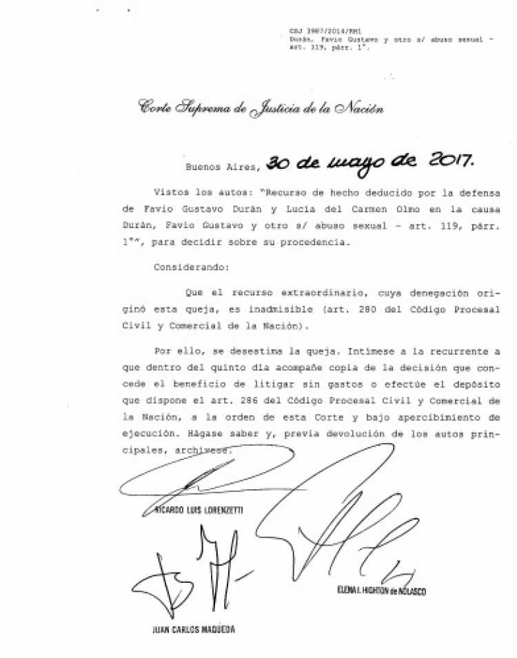 La Corte Suprema de Justicia de la Nación finalmente se expidió en la causa transportistas. El máximo tribunal nacional finalmente decidió desestimar la queja presentada por Fabio Durán (37) y Lucía Olmo (63), razón por la que la sentencia que había recaído sobre ambos a veinte años de prisión finalmente quedó firme. Ante la situación, el Tribunal Penal 2 de Posadas, que en abril pasado había ordenado la excarcelación de ambos por mora judicial, ordenó hace instantes su detención.Durán y Olmo fueron condenados a veinte años de prisión en noviembre de 2011 por abusar de dos niños de 4 y 5 años a quienes llevaban a diario en la escuela. No obstante aquello, los dos estuvieron detenidos durante más de ocho años, hasta que en abril pasado los jueces César Jiménez, Marcelo Cardozo y César Yaya, subrogantes del TP 2 posadeño, ordenaron la excarcelación por mora judicial. El expediente, por ejemplo, durmió durante tres años en el STJ.Tras la excarcelación, el propio STJ presentó una denuncia penal ante los tres jueces, duramente cuestionada por organizaciones nacionales. Ahora, ya con la sentencia firme, Durán y Olmo deberán cumplir lo que resta de la condena en prisión, al menos hasta recibir el beneficio de las salidas transitorias y otros.