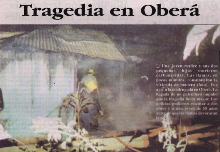 (Nota completa publicada por PRIMERA EDICIÓN el 31 de mayo de 1997)Una mujer y dos de sus pequeñas hijas murieron quemadas ayer cuando la vivienda de madera que habitaban fue consumida por las llamas de un voraz incendio.Otros dos menores y una joven de 18 años, aparentemente empleada doméstica de la casa, salvaron milagrosamente su vida debido al accionar de efectivos del Comando Radioeléctrico que los rescataron de entre las llamas. El incendio se registró pasadas las 1:30 de ayer en la casa ubicada sobre Santiago del Estero al 620 de esta ciudad.A las 1:50 de la madrugada, el Cuartel de Bomberos recibió una llamada de pedido de auxilio, realizada por un vecino del lugar comunicando que la vivienda en cuestión se estaba quemando.Inmediatamente dos dotaciones de bomberos se trasladaron hasta el lugar del siniestro, ubicado a unas 8 cuadras del cuartel.Una patrulla del Comando Radioeléctrico, que se encontraba en las inmediaciones en un patrullaje de rutina, recepcionó el mensaje radial y se trasladó hasta la casa.Fueron los primeros en llegar. Cuando lo hicieron, las llamas ya habían tomado prácticamente la casa, revelaron fuentes policiales. Entonces se inició la tarea de rescate.Pedidos de auxilioLos policías ingresaron a la vivienda respondiendo el pedido de auxilio que salía de adentro, agregó la fuente. En el primer intento los uniformados rescataron a Yanina María de 3 años y a Conrado Enrique de 2. En el segundo intento lograron rescatar a la joven Sonia Rodríguez de 18 años, que aparentemente cuidaba a los niños.Después, aún con la presencia de los bomberos ya combatiendo el fuego, fue imposible realizar un tercer intento por rescatar a las otras personas que permanecían dentro debido al devastador accionar de las llamas. Las víctimas fueron identificadas como Liliana Mabel Szulepa de 23 años y sus dos pequeñas hijas María Patricia de 4 y Paola Cecilia de tan solo seis meses de vida.Los peritos policiales que ingresaron posteriormente encontraron los cuerpos totalmente quemados. El médico policial que los examinó estableció las causas de muerte como "asfixia y quemaduras con carbonización corporal total", revelaron fuentes policiales. Las personas rescatadas, en tanto, fueron trasladadas de inmediato al hospital Samic. Yanina María resultó ilesa y Conrado Enrique con quemaduras leves en el rostro. Sonia Rodríguez presentaba quemaduras de carácter grave en el 70 por ciento del cuerpo, según el primer examen practicado por los médicos. La mujer fue trasladada posteriormente al hospital central Ramón Madariaga de Posadas. De allí fue trasladada a un sanatorio céntrico.Una estufa habría iniciado la tragediaEl incendio que terminó con la vida de una mujer y sus dos hijas se habría iniciado a partir de una estufa que la familia había prendido en la cocina.El artefacto habría sido prendido para secar parte de las prendas de vestir que se habían lavado durante el día y permanecían húmedas a la noche, según el informe preliminar realizado por la policía. "La mujer habría colocado las ropas sobre sillas y de un pequeño tendedero. Al acostarse aparentemente dejó encendido una estufa o calefactor a cuarzo: Esto habría iniciado el incendio", confió una fuente policial.Agregó que cuando el incendio fue detectado, la vivienda ya estaba envuelta en llamas. Las personas no pudieron salir probablemente por el monóxido de carbono producido por el fuego, habrían quedado asfixiadas e imposibilitadas de salir por sí mismas.Los bomberos hicieron lo imposible por ingresar a la vivienda y rescatar a las personas que aún permanecían dentro, pero no fue posible porque la vivienda, construida totalmente de madera con revestimientos de machimbres, ya casi estaba totalmente quemada.