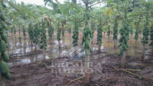 Una extensa plantación de mamones quedó destrozada en parte -alrededor de 40 toneladas, según sus propietarios- por la fuerza del río Uruguay en la zona de Alicia Baja, en el municipio de Colonia Aurora.Allí, el curso de agua llegó a alcanzar los 16,80 metros de altura y provocó graves pérdidas a sus dueños, Luis Scholze y su familia.Es solo un ejemplo de los muchos damnificados que dejó la inundación en esa zona.Fotos: Gentileza Jonhatan Scholze