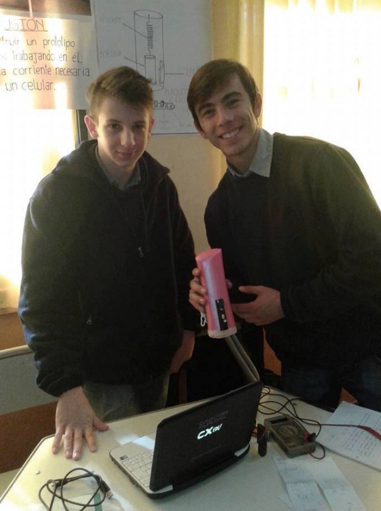 “Es un cilindro que al moverlo genera la energía que permite cargar el celular. Podemos hacerlo mientras caminamos, en el mismo lugar o prendérnoslo al cuerpo cuando salimos a correr: cuando el cuerpo se mueve le damos inercia al cargador y con el mecanismo que tiene adentro genera corriente y carga el celular. Con una hora y media de caminata se logra una carga completa”, explicaron David Bernhardt y Francisco Szmandiuk sobre el particular y novedoso cargador de celulares por movimiento que crearon como alumnos de la Escuela Provincial de Educación Técnica 3 de Oberá.Los jóvenes presentaron su invento en la feria de ciencias y tecnología local. Con él salieron vencedores y pudieron participar en la instancia provincial que se desarrolló en Posadas. Otra vez salieron victoriosos de dicha instancia y así accedieron a la nacional: la cita será en Puerto Iguazú del 21 al 25 de septiembre.