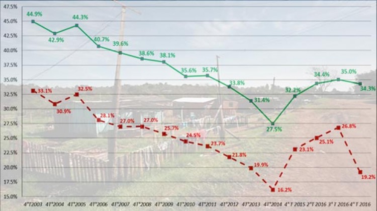 El índice de pobreza multicausal o multidimensional en hogares en el cuarto trimestre de 2016 en el aglomerado Posadas, fue del 34,3%, en tanto que el índice de indigencia en hogares fue del 19,2%, según informó ayer el Instituto Provincial de Estadísticas y Censo (Ipec) de Misiones.Los datos revelaron un descenso importante de la indigencia, ya que el resultado anterior, del tercer trimestre de 2016, reflejó un 26,8%. En tanto, respecto a la pobreza, los índices se mantienen casi iguales, preocupantemente altos. Solo se modificó 0,7%, descendiendo de 35% a 34,3% actual.Al cuarto trimestre de 2016 en el aglomerado Posadas, la cantidad de hogares pobres asciende a 36.594, en tanto que la cantidad de hogares indigentes asciende a 20.484.Es decir, respecto al tercer trimestre de 2016, se redujo en 746 la cantidad de hogares pobres (que pasaron a conformar “hogares no pobres”), y en 8.108 hogares indigentes que pasaron a conformar el segmento de población “hogares pobres no indigentes”.El Ipec explicó en su informe que un hogar puede ser “pobre” o “no pobre”. Pero aquel hogar que es considerado “pobre” puede ser “no indigente” o “indigente”. Al comparar el cuarto trimestre de 2016, con respecto al cuarto trimestre de 2015, la pobreza multidimensional se incrementó en 2,1 puntos porcentuales, que significa 2.241 nuevos hogares pobres (que provenían de “hogares no pobres”). Con respecto a la indigencia en dicho período, la misma decreció 3,9 puntos porcentuales, es decir, 4.161 hogares indigentes pasaron a conformar el segmento de “hogares pobres no indigentes”. Según un informe del Ipec, la disminución de ambos indicadores sociales está relacionada a la desaceleración del aumento del índice de precios al consumidor en la ciudad de Posadas.Según el informe, el Ipec utiliza un mecanismo de medición más preciso, multicausal, que permite determinar en forma fehaciente el movimiento de los indicadores, tomando parámetros que no son medidos por el Instituto Nacional de Estadística y Censos. Se actualizó la canasta básica alimentaria y total (CBA y CBT), con una mayor muestra de variedades y precios.
