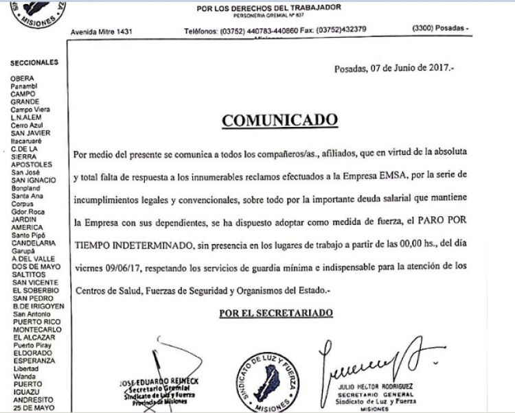 "En virtud de la absoluta y total falta de respuesta a los inmumerables reclamos efectuados a la empresa Emsa, por la serie de incumplimientos legales y convencionales, sobre todo por la importante deuda salarial que mantiene la empresa con sus dependientes, se ha dispuesto adoptar como medida de fuerza el paro por tiempo indeterminado, sin presencia en los lugares de trabajo a partir del día viernes 9 de junio, respetando los servicios de guardia mínima para la atención de los centros de salud, fuerzas de seguridad y organismos del Estado", informó el Sindicato que encabeza Julio "Cachilo" Rodríguez.Con esta breve misiva, decidió presionar a la empresa por numerosos pedidos de este año que no tuvieron respuesta.