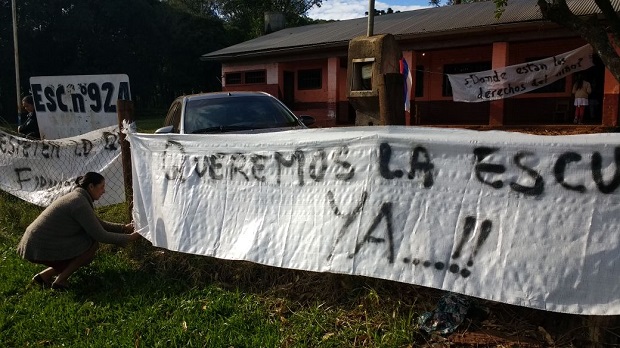 Con carteles alusivos, padres y madres junto a representantes sindicales de la Asociación Trabajadores del Estado, mantuvieron una asamblea en la que decidieron seguir con las acciones de visibilización y protesta, ante un contexto de incumpliento por parte del CGE, que se agravó con la aprobación de una resolución que “borra con el codo” la cesión del terreno destinado a la Escuela 924 para otorgar el mismos a una escuela técnica.“Ya iniciamos gestiones, estuvimos en Posadas, hicimos las presentaciones necesarias y ahora lo que estamos esperando es una respuesta concreta. La comunidad escolar lleva siet años esperando que se construya una escuela para contener a la infancia de los barrios más humildes de San Pedro y es inadmisible que aún no se haya empezado” contó desde la asamblea, el referente de ATE Docentes, Fabio Filártiga.“Las medidas se van a profundizar si no hay respuestas, estamos dispuestos a luchar hasta las últimas consecuencias para que se cumpla lo acordado, que es la construcción de nuestra escuela en el terreno que se nos había sido otorgado a través de una resolución” señaló la asamblea. Fotos: Prensa ATE