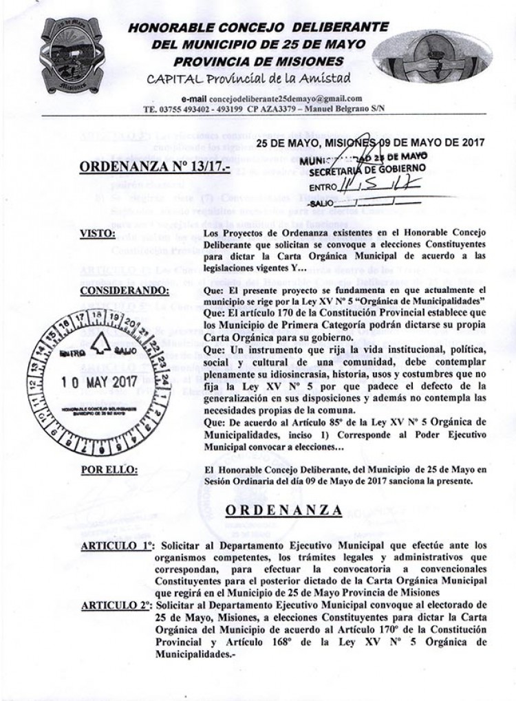 El Municipio de 25 de Mayo convocó a elección de convencionales constituyentes para redactar su Carta Orgánica.Las elecciones se realizarán el 22 de octubre en simultáneo con las elecciones legislativas para elegir concejales municipales, diputados provinciales, diputados nacionales y senadores nacionales.Para la Convención Constituyente se utilizará el mismo régimen y padrón y se elegirán siete convencionales titulares y cuatro suplentes “siendo requisitos necesarios para ser electos convencionales los exigidos para ser concejales dada la similitud de las funciones”, se estableció en el proyecto de convocatoria a elecciones. Los convencionales electos se reunirán dentro de los 30 días de aprobada la elección en el recinto del Concejo Deliberante de 25 de Mayo. La Convención Municipal Constituyente dictará su propio reglamento de funcionamiento y se proveerá de parte del Ejecutivo Municipal la partida “creación de la Carta Orgánica Municipal” dentro del presupuesto municipal 2018 donde se contemplarán los gastos administrativos necesarios y los gastos de funcionamiento de la Convención Municipal. La ordenanza se aprobó teniendo en cuenta varios proyectos de ordenanza existentes que solicitan la convocatoria a la Convención.Además, desde el año 2014 el Municipio elevó su categoría de Segunda a Primera y ello implica que debe modificar su organización interna. El Concejo Deliberante se incrementó de cinco a siete miembros como así también en el Ejecutivo Municipal que inauguró edificio nuevo en esa oportunidad.Actualmente el municipio se rige por la Ley Orgánica de Municipalidades que en su artículo 170 establece que los municipios de primera categoría podrán dictarse su propia carta orgánica para su Gobierno.“Un instrumento que rija la vida política, social y cultural de una comunidad debe contemplar plenamente su idiosincrasia, historia, usos y costumbres que no fija la mencionada ley porque padece el defecto de la generalización en sus disposiciones y no contempla las necesidades propias de la comuna”, indica la ordenanza.Luego de la sanción del Concejo Deliberante, el intendente Omar Wdowin, mediante el decreto 13/2017, realizó la convocatoria a elecciones municipales para convencionales constituyentes el próximo 22 de octubre, el mismo día que todo el país elegirá a sus legisladores municipales, provinciales y nacionales.