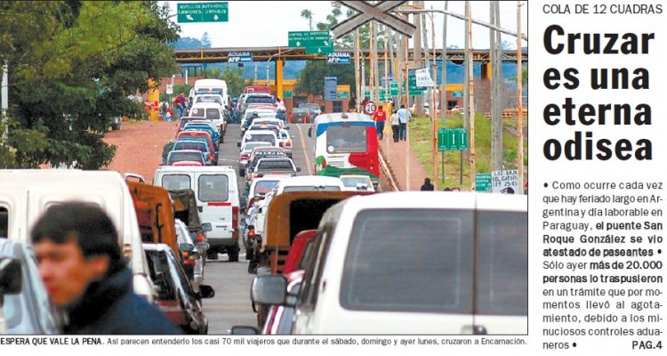 Esta es la trascripción completa de esa nota: "Como suele suceder en cada feriado nacional, el puente internacional San Roque González de Santa Cruz se vio ayer desbordado por los miles de posadeños que aprovechan la jornada hábil en Paraguay para visitar Encarnación, algunos para visitar familiares y amigos, otros para disfrutar de las ofertas gastronómicas del vecino país e incluso algunos para hacer compras, a pesar de que la diferencia cambiaria ya no beneficia a los argentinos sino a los paraguayos y sólo en algunos rubros se puede encontrar buenos precios en la otra orilla.Este fenómeno, con una gran carga folklórica en Posadas, provocó que los automovilistas debieran soportar prolongadas esperas (de hasta dos horas) para trasponer el viaducto internacional, debido a la lentitud de los trámites migratorios, y que se formaran largas colas de vehículos sobre la avenida Mitre, hasta el punto de que a media mañana de ayer y hasta cerca del mediodía la fila llegaba hasta la intersección con López Torres, es decir, hasta doce cuadras.Sumando a los autos y motos particulares, las personas que cruzaron en ómnibus del servicio internacional, en la delegación local de la Dirección Nacional de Migraciones se estima que viajaron hasta Encarnación unas 25 mil personas.Cabe destacar que el sábado ya habían transitado alrededor de 21 mil, según fuentes apostadas en el puente San Roque González de Santa Cruz".