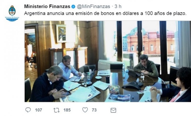 El Gobierno nacional oficializó este lunes que lanzará al mercado una emisión de bonos en dólares a 100 años de plazo."Argentina anuncia una emisión de bonos en dólares a 100 años de plazo", informó el Ministerio de Finanzas a través de su cuenta de Twitter.La cartera de Finanzas añadió a los periodistas acreditados en el Palacio de Hacienda que en el transcurso de la tarde se darán mayores detalles sobre montos y tasas.Fuente: Télam