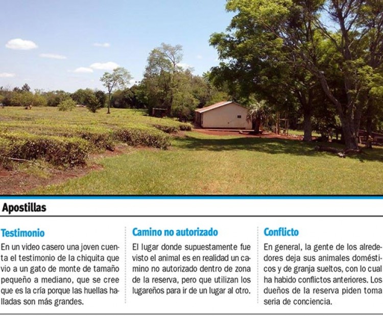 El avistaje de un felino, al parecer de grandes dimensiones, que paseaba junto a su cría en zona de la Reserva Biosfera Larumbe causó alarma entre los vecinos quienes en un primer momento hablaban de salir a cazarlos.La propietaria del lugar, Victoria Larumbe, habló con PRIMERA EDICIÓN respecto del avistaje denunciado por sus vecinos el 16 de junio pasado y del hallazgo de las huellas en área de su terreno. Aunque no pudo dar muchas precisiones aún, señaló que el encargado y los guardafaunas del lugar trabajaron sobre los rastros para determinar a qué animal pertenecen las huellas, aunque se cree que podrían ser un yaguareté y una cría de tamaño mediano. “Una vecina me dio aviso muy alarmada, de todas formas y para impedir cualquier tipo de acción dañina estamos advirtiendo a los vecinos que cazar a ese animal es delito, pero más no podemos hacer”, sostuvo. De acuerdo a sus palabras, gente del Ministerio de Ecología habló con la gente de la zona y buscó rastros. “Me dijeron que en cuanto tengan una conclusión clara del tema, me lo harían saber. O sea que estoy a la espera de noticias. En cuanto vuelvan los guardafaunas del lugar lo sabremos todo”, se explayó. AsustadosEl relato de una joven, que fue captado en un video casero, da cuenta del testimonio de la menor que asegura haber visto un pequeño felino que se movía en un camino donde la gente suele transitar a menudo. Contó haberlo visto salir del monte y luego volver a meterse. “El caso es que los vecinos utilizaron como lugar de paso un área natural protegida no autorizada para el paso libre de personas. Ahí el incidente y el conflicto que es mayor, porque en la zona ya merodea un gato onza que es una especie protegida que ha tenido conflicto con los vecinos por comerse las gallinas”, explicó Larumbe. Opinó la mujer: “Hará falta una campaña de concienciación a la gente para que se acostumbre a tener sus gallinas en gallineros acondicionados como para que estos animales no se acerquen a las zonas habitadas. Además de que no pueden cazarlos ni acceder a Áreas Naturales Protegidas, que es el caso, sin autorización. Muchas gracias por interesarte y un saludo.Consultado por este Diario, el ambientalista Amado Martínez, sobre el caso por su experiencia en rescate de fauna autóctona, opinó que es improbable que se trate de un yaguareté -como se dijo en un primer momento- porque en la zona de Alberdi hace años dejó ser frecuentado por estos grandes felinos. “Va a requerir ir hasta el lugar y hacer un trabajo debido, porque por las medidas tomadas a las huellas, no es un animal pequeño”, analizó. Explicó Martínez: “La reserva es pequeña, tiene apenas 48 hectáreas, puede parecer por cualquier lado. Tengo entendido que tanto la Red Yaguareté como Ecología van a intervenir”. Por lo pronto se volvió a insistir con que todas las denuncias se hagan en la comisaría local o ante las autoridades de Ecología, ya que está prohibido matar al animal, que es especie protegida en Misiones. Escueta respuesta de EcologíaDesde el Ministerio de Ecología, recién este jueves enviaron un comunicado de prensa, explicando lo que desde su visión, afirman que pasó en la reserva Larumbe de Colonia Alberdi.Según indicaron en el comunicado, los “guardaparques de Zona Sur dependientes del Ministerio de Ecología y Recursos Naturales Renovables de Misiones, el pasado día martes 20 del corriente mes dieron respuesta a una denuncia efectuada por la propietaria de una reserva privada situada en la localidad de Colonia Alberdi -departamento Oberá-, sobre avistamiento de un ejemplar felino con sus crías. Los guardaparques no hallaron novedades sobre los felinos en cuestión, detectando únicamente huellas de fauna referidas a felinos chicos como “tirica”, zorros, tatúes, venado y otros, pero no de un felino de gran porte, aunque también huellas de animales domésticos”. Por otro lado, indicaron que el lugar y la zona no presenta condiciones para que haya un yaguareté o puma, solo se podría dar si este está de paso de una zona a otra. “Estas acciones son comunes en toda la provincia dado por la gran biodiversidad reinante”.