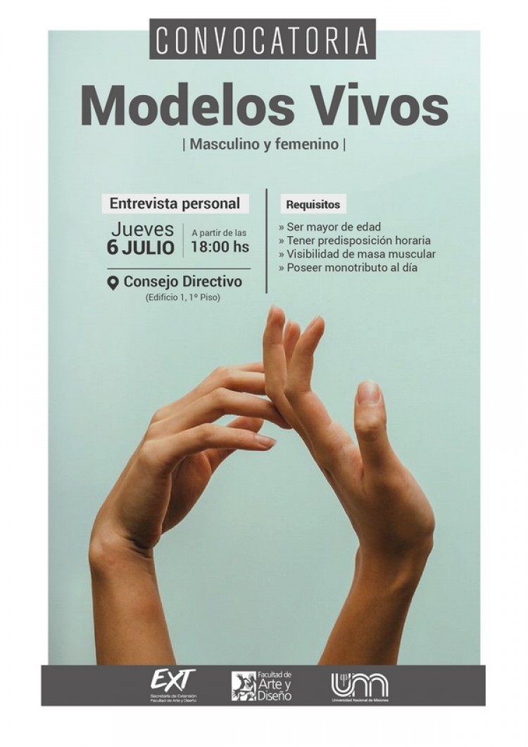 La Facultad de Arte y Diseño de la UNaM, con sede en Oberá, seleccionará a dos personas que cumplan las funciones de modelos vivos (masculino y femenino) en las cátedras de Artes Plásticas que así lo requieran. De acuerdo a lo informado por la carrera, los candidatos deberán tener las siguientes características: ser mayor de edad, tener predisposición horaria para el cumplimiento de la actividad, ser de estatura media-alta y visibilidad de masa muscular.Los interesados, además, deben contar con monotributo al día y presentarse el 6 de Julio a las 18:00 en la sede de la Facultad, en Carhué 832, para realizar la entrevista personal.