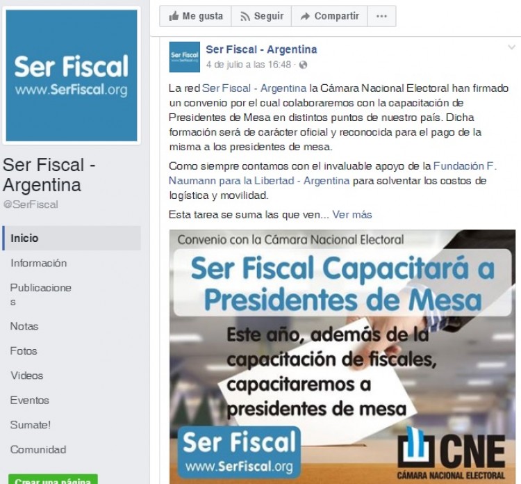 La Cámara Nacional Electoral (CNE) firmó un "convenio de colaboración" con la red <a href="https://web.facebook.com/SerFiscal?_rdc=1&_rdr">Ser Fiscal</a>, una ONG integrada por una serie de organizaciones vinculadas con el oficialismo para capacitar a las autoridades de mesa para las próximas elecciones.La red Ser Fiscal está encabezada por Claudio Bargach, un funcionario del Gobierno nacional y dirigente del partido Unión por la Libertad que se referencia en la ministra de Seguridad, Patricia Bullrich.La decisión de los camaristas Santiago Corcuera y Alberto Dalla Vía se difundió por las propias redes sociales de Ser Fiscal."Este año, además de la capacitación de fiscales, capacitaremos a presidentes de mesa", explicaban en un flyer elaborado para dar a conocer el convenio firmado el 27 de junio.Según el escueto documento, que consta de cinco cláusulas, la CNE se compromete a brindarle "la información necesaria para la elaboración e instrumentación de cursos de capacitación cívica- electoral para autoridades de mesa".Por su parte, Ser Fiscal se compromete a "llevar adelante actividades de capacitación, información y difusión dirigida a autoridades de mesa a fin de interiorizarlos sobre los diversos aspectos del proceso electoral y promover la concientización de sus derechos político electorales".La red de ONGs vinculadas a Cambiemos armará el equipo de capacitadores, pondrá a disposición las aulas y "cualquier otra herramienta o infraestructura que resulte imprescindible para la consecución de los objetivos comunes a las partes, sin perjuicio de la eventual participación de un disertante de la CNE".<a href="https://web.facebook.com/SerFiscal?_rdc=1&_rdr">En su propia cuenta de Facebook, Ser Fiscal reconoce quién financiará la capacitación a las autoridades de mesa, delegada por el Estado</a>."Como siempre contamos con el invaluable apoyo de la Fundación F. Naumann para la Libertad-Argentina para solventar los costos de logística y movilidad", detallaron.La red de ONG está integrada por la Sociedad Rural Argentina, la Asociación Cristiana de Jóvenes; la Fundación LED, encabezada por la funcionaria Silvana Giudici; el Movimiento Humanista de Resistencia y Construcción 2012, creado por Elisa Carrió, entre otros.Fuente: NA