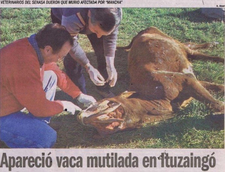 (Nota publicada por PRIMERA EDICIÓN el 9 de julio de 2002) Un ejemplar de Hereford, de 9 meses de edad y aproximadamente 240 kilos de peso, murió afectado por "mancha" en un campo de la segunda sección del departamento de Ituzaingó (Corrientes), según lo determinaron los veterinarios Horacio Angélico y Enrique Ciancanglini, ambos representantes del Senasa local y de Posadas, respectivamente. El misterio volvió a presentarse en un campo argentino, esta vez muy cerca de Posadas, en la estancia El Timbó. El encargado del lugar, Marcelo Alonso, comentó que el sábado por la tarde notaron que "el animal rengueaba, y el domingo temprano uno de los peones me avisó que vio a la vaca muerta en medio del campo, cuando nos acercamos a verla estaba en estas condiciones, mutilada, por lo que decidimos llamar a las autoridades del Senasa".Alonso cubrió con una carpa el cadáver, para evitar que animales carroñeros lo devoren, y esperó a que llegaran representantes del Senasa. Ayer por la tarde una comitiva de profesionales se presentó en el lugar a tratar de develar el misterio.Similar a otros casosEl cadáver de la vaca, a pesar de que ya habían pasado más de 24 horas desde que la encontraron muerta, no presentaba "rigidez cadavérica", lo que llamó la atención de los profesionales, habida cuenta de que pasadas 12 horas a partir del momento de la muerte, los animales ya presentan signos de rigidez. Tampoco presentaba signos de descomposición o putrefacción, a pesar de que estuvo a la intemperie desde el domingo hasta ayer por la tarde, cuando los representantes del Senasa sugirieron cremarlo. Las mutilaciones dejaron a este cadáver sin lengua, hueso hioides, músculos maceteros del malar inferior completo y parte del maxilar superior, faringe, laringe y esófago de la parte superior, ojos, ano y vulva. Lo más llamativo, tanto para los profesionales como para los demás presentes en el lugar, fue que si bien al animal le extrajeron los ojos, las órbitas oculares estaban intactas, sin que existan rastros de desgarro o corte alguno. En el lugar donde hallaron a la vaca no encontraron huellas de ningún roedor, ni rastros que pudieran suponer el ataque de alguna persona o animal, y al igual que en los demás casos que se registraron en el país, aquí tampoco se hallaron huellas de sangre y los cortes realizados en el maxilar y las demás áreas eran cortes netos, sin desgarros, y que estaban prácticamente cicatrizados, sin rastros de sangre.Muerte naturalNo obstante, quedó determinado que la causa de la muerte de este bovino fue una enfermedad conocida como "mancha" y gangrena gaseosa (conclusión a la que arribaron los profesionales luego de la necropsia), enfermedad que suele presentarse en los bovinos. La mancha es una enfermedad bacteriana producida por un clostirideo y que generalmente ataca a animales jóvenes y gordos. Lo cierto es que apareció otra vaca mutilada que se suma a las que se encontraron en diferentes regiones del país en los últimos tiempos. Y también es cierto que por mucho que algunos traten de atribuir las mutilaciones al hocicudo rojizo, son muchos también los que no creen en que un pequeño roedor se lleve siempre las mismas partes de los animales.Además quedan muchos interrogantes sin responder, como por ejemplo a qué se debe la falta de rigidez cadavérica, etcétera.