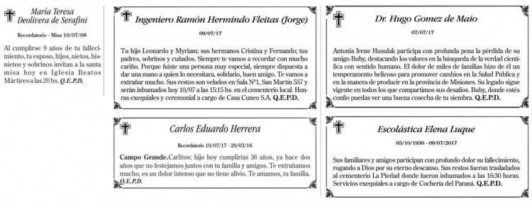 Fúnebres del lunes 10 de julio de 2017