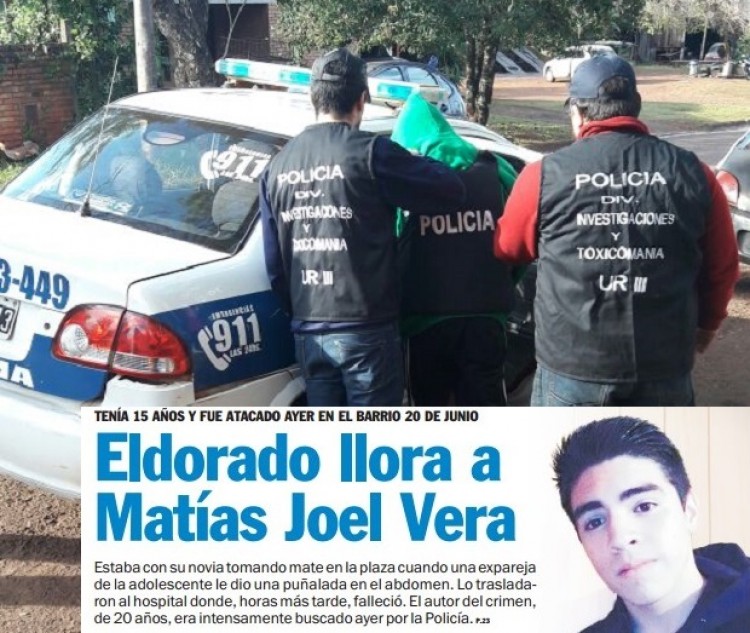 En base a las pruebas que obran en el expediente, en las últimas horas recibió la prisión preventiva el joven de 20 años que permanece detenido y sospechado de <a href="http://www.primeraedicion.com.ar/nota/248833/eldorado-llora-a-matias-joel-vera.html">matar de un puntazo en el abdomen a Matías Joel Vera (15)</a>, en un episodio que aún genera conmoción en Eldorado.Fuentes ligadas al caso confirmaron a PRIMERA?EDICIÓN que la medida cautelar fue adoptada por la magistrada Nuria Allou, titular del Juzgado de Instrucción 2 de la Tercera Circunscripción Judicial ante el “riesgo procesal” latente en el proceso, pero también debido a la gravedad del hecho.Notificado de la resolución judicial, el acusado fue trasladado desde la sede policial en la que se encontraba hacia la Unidad Penal III?del?Servicio Penitenciario Provincial, en Eldorado, donde probablemente aguarde tras las rejas la llegada del juicio oral y público.En la prisión preventiva decretada por Allou se ratificó, además, la acusación formal con la que se inició la causa, “homicidio simple”, razón por la que el muchacho podría recibir entre 8 y 25 años de prisión en caso de ser hallado culpable por un tribunal penal.Mientras tanto, las autoridades del caso aguardan por la declaración en Cámara Gesell de la principal testigo del caso, una adolescente de 14 años que es expareja del imputado y se encontraba tomando mate con Vera en una plaza del barrio 20 de Junio de Eldorado cuando todo sucedió.Ése sería el motivo del ataque fatal, al menos en base a la reconstrucción que hasta el momento mantienen los investigadores de la Unidad Regional III y la jueza a cargo de la causa.Al decir de esa teoría, Vera compartía la noche del lunes 12 de junio con la menor de edad en la plazoleta de calle Rivadavia y Francisco López cuando se presentó el acusado, quien aparentemente le recriminó aquella situación. Acto seguido, habría amenazado e incluso iniciado una agresión verbal que rápidamente pasó a lo físico en contra de la víctima.La autopsia confirmó que el adolescente recibió un solo puntazo en el abdomen. Fue derivado de urgencia al hospital Samic, donde pese al esfuerzo de los médicos, dejó de existir alrededor de las 10.50 del martes 13 de junio.La noticia generó enorme conmoción en Eldorado. El sospechoso logró darse a la fuga con el arma homicida, aunque la presión ejercida por los detectives derivó en su entrega, el jueves 15 de junio.Antes de presentarse en la comisaría, el acusado hizo trascender a los medios un mensaje de voz vía Whatsapp en el que confesaba el crimen, aunque aseguraba que había forcejeado con Vera, quien “cayó” sobre el cuchillo que la propia víctima había traído, siempre según sus dichos.Sin embargo, ese mismo día pero por la tarde, la principal testigo rompió el silencio -también vía Whatsapp- y desacreditó aquella versión. Aseguró que el imputado llegó armado y, pese a que trató de frenarlo, atacó sin motivo alguno a Vera.