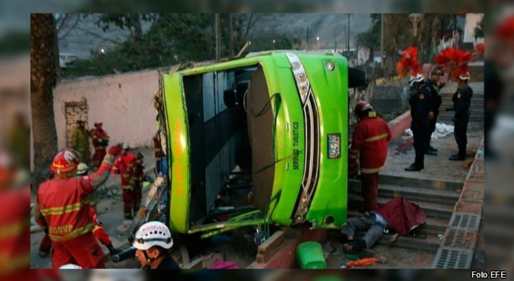 Al menos nueve muertos y 35 heridos dejó hasta el momento el vuelco de un micro turístico de la empresa Green Bus que ayer perdió el control cuando bajaba del cerro San Cristóbal, en el distrito de Rímac, en Lima, Perú.El transporte, en el que viajaban unos 40 pasajeros desbarrancó este domingo, alrededor de las 16:53 (14:53, hora en Argentina), a la altura de la avenida Alameda de Los Bobos, cerca del club Revólver del Rímac, cuando regresaba del cerro San Cristóbal, según el diario peruano El Comercio.Un video muestra el momento exacto en que el micro, al tomar una curva, vuelca y cae por el barranco.En la filmación se ve pasar primero sin problemas a un bus similar de dos pisos descubierto. Atrás viene otro, de color verde, que pierde el control y cae.Más de 15 unidades de bomberos atendieron a los accidentados y confirmaron que siete personas fallecieron por la caída y que otras dos murieron en los hospitales, por lo que la cifra asciende a nueve víctimas fatales, indicó la mencionada fuente.Entre los heridos se encuentran dos extranjeros, un chileno y un canadiense, además de siete niños, informó un portavoz del Cuerpo General de Bomberos del Perú.Siete metros cuesta abajoEl vehículo de dos pisos, con la parte superior descubierta, rodó alrededor de siete metros en el cerro, cuando bajaba después de llevar a un grupo de turistas a conocer esa parte del centro de Lima.A raíz del vuelco, cuatro personas salieron despedidas del bus y tres terminaron debajo de la carrocería, lo que les produjo la muerte por aplastamiento, informó un portavoz de la Policía a RPP Noticias.El cerro San Cristóbal ofrece una vista panorámica de Lima y los buses para llegar hasta ahí suelen salir de la Plaza de Armas, en el centro histórico, donde muchos turistas acuden para conocer el Palacio de Gobierno y la Catedral de Lima.Fuente:Clarín