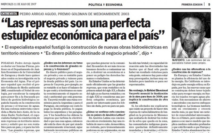 (Entrevista publicada por PRIMERA EDICIÓN el 11 de julio de 2007)Pedro Arrojo Agudo es doctor en Ciencias Físicas, profesor en el Departamento de Análisis Económico de la Universidad de Zaragoza y desde hace quince años centra su investigación en la Economía del Agua. Fue el primer español que recibió el premio Goldman de Medio ambiente 2003, considerado el Nobel de ecología, por encabezar la campaña para poner fin a la fracasada política de gestión hidrológica española basada en la construcción de presas y el trasvase de aguas.En una extensa entrevista concedida a María Inés Aiuto, de la cadena Radio Nederland, el especialista fustigó la construcción de más represas en territorio misionero y señaló que no son rentables para un país, y sí para los lobbies.“Las grandes represas, que eran rentables en la primera mitad del siglo XX, a finales del siglo ya no lo fueron y en el siglo XXI se consideran una perfecta estupidez económica, que puede ser interesante para los lobbies, sin duda, pero no para un país”, señaló.¿Cuáles son los intereses en torno a la construcción de grandes represas y/o trasvases?Es dinero público para el negocio privado y eso es rentable para el negocio privado y ruinoso para la deuda pública del país. La represa de Yacyreta, por ejemplo, no es rentable si se hace el balance de lo que costó y si tuviéramos en cuenta económicamente el impacto social y ambiental que está generando. Yacyretá resultó una ruina económica para la Argentina y para el Paraguay, sin embargo ese costo lo paga la deuda pública, lo pagan todos los argentinos y los paraguayos. Y los beneficios los obtiene la empresa que turbina la electricidad o que usa esas aguas, entonces ahí está la clave de por qué siendo económicamente irracional, sigue habiendo inversiones públicas en nombre del interés general, que en realidad es el interés de los poderosos.¿Cuáles son las variables a tener en cuenta antes de aprobar la construcción de una represa?Hay que pensar en los impactos que puedan generar en la comunidad. En nombre de ser más ricos no tenemos derecho a contaminar un río, a destruir un ecosistema ni a poner en peligro los derechos humanos o ciudadanos.En Estados Unidos se ha determinado oficialmente que las grandes represas, que eran rentables en la primera mitad del siglo XX, a finales del siglo ya no fueron rentables y en el siglo XXI se consideran una perfecta estupidez económica, que puede ser interesante para los lobbies, sin duda, pero no para un país.¿Cómo se sostiene esta conciencia en países de América Latina?En América Latina esa conciencia está en crecimiento, hay una rebeliónde nuevo cuño, democrática, no violenta, pero tremendamentepoderosa en sus argumentos, en sus capacidades de transformación.Estuve con los afectados de Yacyretá (que en esa época protestaban en Buenos Aires, hacinados en un galpón de Chacarita) y se me cayeron las lágrimas de rabia, de impotencia. Entonces hay para estar muy preocupados, incluso muy enfadados, pero también es para ser esperanzados.¿Cuáles son las alternativas a la construcción de represas?En Europa y en Estados Unidos se plantea la eficiencia del uso de la energía. En California se introdujo en parte energía eólica; en España, por ley, las nuevas casas que se construyan deben tener tejado solar para recoger energía; en Suecia los tejados recogen aguas pluviales.Son mecanismos de ahorro o ancestrales con nuevos enfoques tecnológicos. La biomasa también está en crecimiento y crecerá mucho más, ya que tiene un carácter de renovabilidad interesante.Ese es el futuro, pero mientras llegamos a ese nuevo modelo que implica cambios culturales profundos y que está llevando a que Europa y Estados Unidos abandonen las viejas tecnologías del hormigón o de la energía nuclear, hay que empezar por sustituirlas por energías más blandas y renovales. Esa especie de chantaje de que si no hacemos la gran represa colapsamos la economía no está justificado con razones, sino con demagogia.