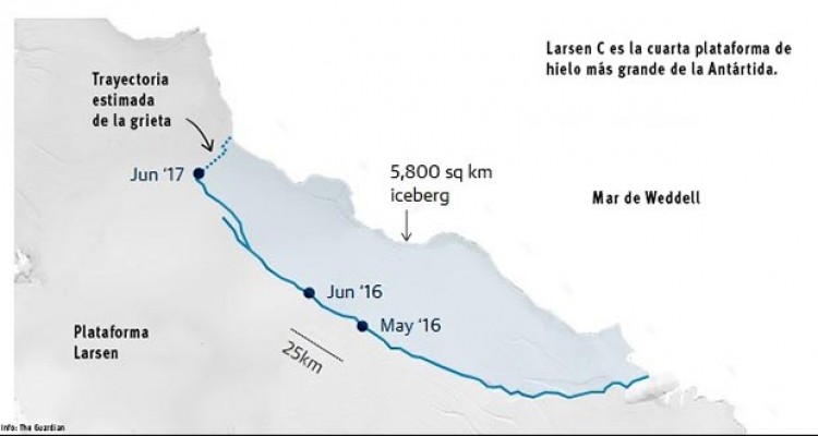 El llamado inicialmente iceberg Larsen C, pero que recibirá el nombre de A68, tiene la mitad del tamaño del iceberg B15, que se separó de la plataforma de hielo Ross en el año 2000, señaló <a href="https://www.theguardian.com/world/2017/jul/12/giant-antarctic-iceberg-breaks-free-of-larsen-c-ice-shelf">The Guardian</a>.<a href="http://www.primeraedicion.com.ar/nota/249029/como-crece-la-grieta-gigante-en-la-antartida.html" style="font-family: verdana; font-size: small;">La enorme fisura que ha originado este nuevo iceberg ha estado creciendo durante un periodo de dos años. </a>Solo desde el 25 de mayo hasta el 31 de ese mismo mes, la brecha creció 17 kilómetros y en los últimos días los datos recogidos muestran que la grieta se había ramificado en varias ocasiones.“Ahora vemos un gran iceberg, pero es probable que se rompa en pedazos a medida que pase el tiempo”, indicó Adrian Luckman, líder del proyecto británico Midas, que monitorea la región.El desprendimiento de este iceberg es particularmente importante ya que, según la ESA, por sus dimensiones podría “plantear una amenaza al transporte marítimo”.El desmoronamiento del Larsen C forma parte de una tendencia más amplia de reducción de los estantes de hielo en la región que los científicos vinculan con los efectos del calentamiento global. Sin embargo, el desprendimiento del iceberg no elevará los niveles del mar de manera considerable, destaca RT.“Hay suficiente hielo en la Antártida que si todo se derrite, o siquiera se derrama en el océano, el nivel del mar subirá 60 metros”, expresó Martin Siegert, profesor de geociencias en el Imperial College de Londres y co-director de la Grantham Instituto de Cambio Climático y Medio Ambiente, citado por The Guardian.Pero si bien el nacimiento del enorme iceberg podría parecer dramático, los expertos afirman que no se traducirá en un aumento del nivel del mar.“Es como su cubo de hielo en su ginebra y tónico – ya está flotando y si se derrite no cambia el volumen de agua en el vaso por mucho en absoluto”, agregó Hogg. Después del colapso de la plataforma de hielo más septentrional de Larsen A en 1995 y de Larsen B en 2002, todos los ojos se han dirigido a Larsen C.Pero Siegert se apresuró a señalar que el parto del nuevo iceberg no es una señal de que la plataforma de hielo esté a punto de desintegrarse, haciendo hincapié en que los estantes de hielo se rompen naturalmente a medida que se extienden hacia el océano.“No me preocupa demasiado, no es el primer mega iceberg que se ha formado”, dijo.Andrew Shepherd, profesor de Observación de la Tierra en la Universidad de Leeds, estuvo de acuerdo. “Todo el mundo ama a un buen iceberg, y este es un corker”, dijo. “Pero a pesar de mantenernos esperando durante tanto tiempo, estoy bastante seguro de que la Antártida no va a derramar una lágrima cuando se ha ido porque el continente pierde mucho de su hielo de esta manera cada año, y por lo que es realmente sólo negocio como siempre".Fuente: Medios Digitales
