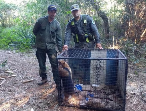 El martes por la mañana, el efectivo de guardia de los Bomberos Voluntarios de San Vicente recibió un llamado a través del cual le informaron de que en un aserradero había aparecido un ejemplar de tamanduá u oso melero, entre las maderas de un aserradero en inmediaciones del kilómetro 979 de la ruta nacional 14, a unos 4.000 metros del cuartel de bomberos. De inmediato, el hombre convocó a los integrantes del escuadrón de rescate de animales que tienen los bomberos y se pusieron en marcha para capturar al animal.Los bomberos se encontraron con un ejemplar hembra de unos 70 centímetros de alto que buscaba refugiarse de la luz y estaba aturdido por la presencia de los trabajadores. Los integrantes del escuadrón de rescate tomaron un lazo que utilizan habitualmente para esta tarea y lo atraparon. Luego con mucho cuidado lo encerraron en una jaula y lo trasladaron al cuartel.El animal no estaba herido, solo un poco confundido, y no presentó mucha resistencia a sus captores. Por la tarde el oso hormiguero fue llevado por efectivos de Gendarmería Nacional a los guardafaunas del Ministerio de Ecología y Recursos Naturales Renovables, que lo liberaron en una reserva en la zona de San Pedro.Uno de los integrantes del escuadrón de rescate, Jorge Scheilmes, contó que “siempre nos llaman para capturar animales silvestres que se encuentran en alguna casa. Por lo general es en la parte urbana donde los encuentran y nos llaman. Este es el tercer oso hormiguero que capturamos. Pero también capturamos erizos, coatíes, tatúes y hasta un pichón de yacaré  el año pasado. Pero por lo que más nos llaman es por la presencia de víboras y abejas”.El bombero aclaró que “la gente nos llama muchas veces porque ven el animal silvestre y quieren que lo salvemos. Otras veces porque tienen miedo como en el caso de víboras. Como la gente le tiene miedo y sabe que estamos preparados para tratar con este tipo de animales nos llama. En los últimos meses nos llamaron por la presencia de enjambres de abejas que se refugian en algún agujero de un poste de o árbol, o alguna cubierta o bien en las casas. En el caso de animales chicos como erizos, coatíes o comadrejas, que no son peligrosos, los liberamos en algún monte cerca”, sin embargo “cuando sí representan peligro para la gente llamamos a ecología para que los liberen en algún parque o reserva. En el caso de las víboras, llamamos a los serpentarios que hay en la provincia para que los lleven”, finalizó Scheilmes.Fotos: Prensa GN