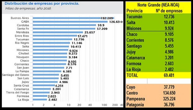 En todo el país hay más de 600 mil empresas activas, de las cuales casi 10 mil están ubicadas en Misiones, siendo la provincia con mayor cantidad de compañías en todo el Noreste Argentino (NEA). El informe revela que el NEA concentra 30.208 empresas, mientras que en Argentina hay 605 mil empresas activas, de las cuales el 99% son pymes, mientras que el 0,6% representa a grandes compañías que a su vez generan el 36% del empleo, contra un 64 por ciento de las pequeñas o micro empresas.El relevamiento fue realizado por el “GPS de Empresas Argentinas” del Ministerio de Producción de la Nación y en el se detalla que entre las provincias del NEA, la lista es encabezada por Misiones cuenta con 9.924 firmas activas, mientras que Chaco tiene 9.105, Corrientes 8.576 y Formosa apenas 2.603. Esta plataforma digital está destinada a dar a conocer los datos del sistema productivo de la Argentina. En el caso del Norte Grande hay 69.481 empresas, pero el Noroeste Argentino (NOA) concentra 39.273. El estudio reveló que “en Tucumán, la mayor economía del Norte Grande, existen 12.736 firmas, lo que representa un 2,11% del total nacional”. Mientras que “en la otra punta, economías más débiles como las de La Rioja, Formosa y Catamarca, el número de empresas llega a 2.482, 2.603 y 3.201 respectivamente”.“Un dato muy significativo es que el 72% de las empresas argentinas se encuentra en Capital Federal, Buenos Aires, Córdoba y Santa Fe, mientras que el NEA y el NOA concentran el 10% de la cifra total, dejando expuestas las desigualdades territoriales”, según los datos del estudio que además remarca que “mientras en Caba hay 44 empresas cada mil habitantes, en el Norte argentino hay menos de 9”. En otras regiones, como Cuyo, Centro y Patagonia, hay entre 11 y 23 empresas cada mil habitantes.Además, el relevamiento indica que “más del 99% (602.079) de las empresas activas tiene menos de 200 empleados ocupados y conforman el segmento pyme y micropyme, mientras que el 0,6% (3.547) son grandes empresas”.Puestos laboralesEn lo que respecta al empleo, el informe concluyó que “las firmas de hasta 200 empleados, sector conformado por pymes y micropymes, explican el 64% del empleo privado formal que existe en el país. Entre 2007 y 2011 el número de compañías creció 8%, lo que significó un aumento de 11.183 empresas por año en promedio, mientras que partir de 2011 la cantidad se estancó en torno a las 610.000 y en 2014 retrocedió hasta las 602.079”.Del total de las empresas relevadas, se registró que el 31,4% son comercios, seguidas por actividades agropecuarias y manufacturas, con 10,9% y 10,2 respectivamente, según detalló el informe de Iprofesional.Desgranando la lista: “Transporte y almacenamiento, 9,26%; servicios científicos y técnicos, 6,5%; hotelería y gastronomía, 5,97%; construcción, 4,96%; salud, 4,41%; inmobiliarias y servicios de alquiler, 4,02%; actividades administrativas, 2,83%; ocio, 1,73%; comunicaciones, 1,6%; enseñanza, 1,49%; servicios financieros y seguros, 1,11%, minería y petróleo, 0,22%; suministros de agua y de residuos, 0,19% y suministro de gas y electricidad, 0,12%”. Desde esta plataforma informaron que está conformada por indicadores construidos en base a registros administrativos provenientes de declaraciones de seguridad social del padrón de empresas empleadoras y de empresas exportadoras. Una de las particularidades del padrón es que registró el universo de empresas argentinas que declararon empleados hasta el año pasado y, por lo tanto, no incluye empresas informales o empresas unipersonales.