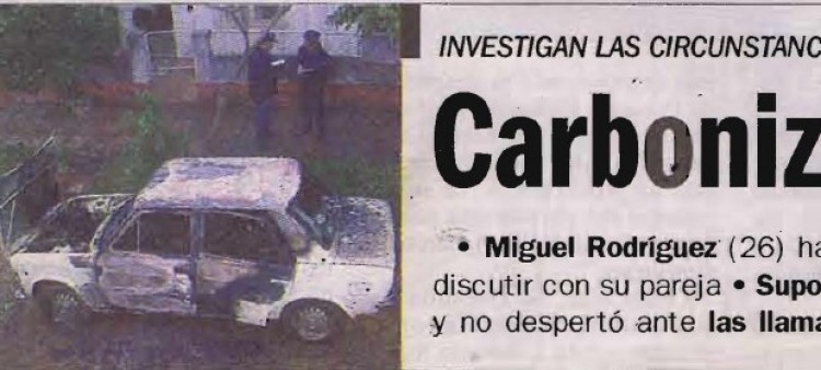 (Nota publicada por PRIMERA EDICIÓN el 20 de julio de 2002)La Policía investiga la muerte de un hombre cuyo cuerpo apareció en el interior de un automóvil que explotó. Si bien a todas luces Miguel Enrique Rodríguez, de 26 años, habría muerto por la acción del fuego, tal como se expone en el informe médico preliminar, el caso fue caratulado como "muerte dudosa".El cadáver de Rodríguez, quien en vida se desempeñaba como comerciante, fue encontrado ayer a la mañana en el interior de su vehículo, un Fiat 128 de color blanco, estacionado con el frente hacia el Norte. El rodado permanecía estacionado sobre la calle Gómez Portinho, frente al domicilio de la ex concubina de la víctima. Al parecer, la noche del jueves ambos protagonizaron una discusión, pero algunos testigos manifestaron que los problemas de la pareja no eran recientes sino de vieja data.Lo cierto es que Rodríguez habría decidido pasar la noche en su Fiat, coche en el que se encontraron varias de sus pertenencias.Fuentes policiales manifestaron que el sujeto se retiró de la casa cerca de las 2.30 rumbo al coche.Ayer a las 7 los vecinos despertaron alarmados por una explosión en la vía pública. Al salir advirtieron el coche en llamas y se comunicaron con los bomberos. Una dotación del cuartel de la Zona Sur partió hacia el lugar y, mientras extinguían las llamas, advirtieron la existencia de un cuerpo prácticamente carbonizado en el asiento trasero del vehículo. El exsuegro de la víctima lo reconoció enseguida y manifestó que ese coche le pertenecía a Rodríguez.En el baúl del Fiat encontraron bolsos con prendas de vestir y otros elementos pertenecientes a las víctima. Entre los asientos se habría hallado una botella. Los voceros indicaron que en la billetera de Rodríguez se encontraron esquelas pero que nada tendrían que ver con la muerte. Entre las posibilidades que se barajan existe la de un incendio generado por un cortocircuito en el coche. Como Rodríguez dormía y las ventanillas estaban cerradas, se habría producido una asfixia por inhalación de monóxido de carbono.
