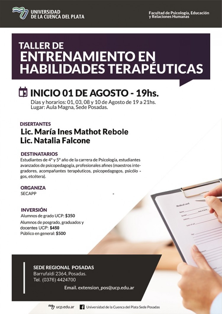 Desde el Servicio de Consultoría y Atención Psicológica y Psicopedagógica –SeCAPP- de la Sede Regional Posadas,  a través de la Facultad de Psicología, Educación y Relaciones Humanas de la Universidad de la Cuenca del Plata exponen que la realización del taller se centra en que las habilidades terapéuticas son aquellas capacidades que todo terapeuta debe poseer para establecer una buena relación terapéutica, promover la empatía, incrementar la motivación al cambio y disminuir la resistencia de los pacientes. Al concebirse como habilidades, entonces, quiere plantearse que pueden ser aprendidas. La capacitación pretende enseñar las bases de la relación terapéutica profesional-paciente y que el asistente practique procedimientos de fortalecimiento de la alianza terapéutica aplicado a viñetas clínicas. Durante los cuatro módulos serán presentadas  herramientas clínicas para situaciones especiales en el desempeño profesional, y se ejercitarán role playings y otras técnicas didácticas para probar el uso de las técnicas enseñadas. Con un total de 4 módulos a desarrollarse los días martes 1ro, jueves 03, martes 08 y jueves 10 de agosto, de 19 a 21hs; en la Sede Posadas de la UCP, tiene un valor de $350 (pesos trescientos cincuenta) para estudiantes de grado UCP; $450 (pesos cuatrocientos cincuenta) para estudiantes de posgrado, egresados y docentes UCP; y de $500 (pesos quinientos) para público en general.Por informes e inscripción, las vías de contacto disponibles son: [email protected], el  tel.: (0376) 4424700  o  personalmente a la UCP.