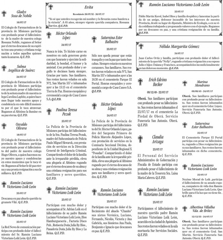 Fúnebres del miércoles 26 de julio de 2017
