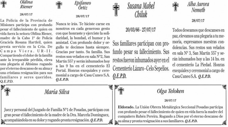 Fúnebres del sábado 29 de julio de 2017
