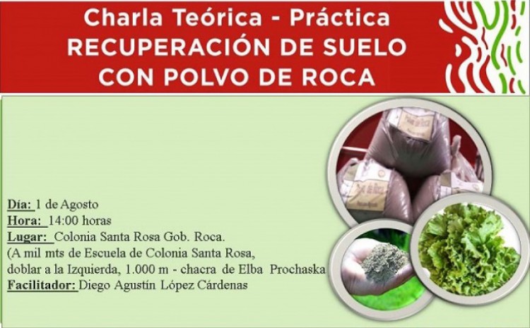 El polvo de roca aplicado a la Agricultura fue descubierto y desarrollado por Julius Hensel, científico alemán, hace más de 100 años.El polvo de basalto (roca madre de la de Misiones) es un subproducto que se obtiene de las canteras que se encuentran en la Provincia de Misiones. Actualmente existen alrededor de 15 explotaciones en donde se obtiene principalmente piedra triturada.Los Polvos de Roca han demostrado su efectividad en la remineralización y además de aportar los nutrientes básicos, éstas aportan una gran cantidad de oligoelementos y elementos trazas, asimismo contiene las denominadas tierras raras que cumplen un papel muy importante en el desarrollo de los sistemas de defensa de las plantas, así como en la calidad nutracéutica de los alimentos.En estudios recientes realizados sobre la roca de basalto en diferentes puntos de Misiones, se pueden contar más de 45  elementos presentes en el polvo de roca. Cada uno de estos  elementos presentes son utilizados por las plantas para llevar adelante funciones vitales, y cuanto más diversidad de minerales hay presentes en la roca madre, mejores condiciones de vida para todas las especies vegetales existentes.                      Organizada por la Subsecretaría de Desarrollo Productivo dependiente de la Secretaría de Estado de Agricultura Familiar, el taller es libre gratuito, abierto a todo público. Para más información comuníquese al 3764202683   Cómo llegar a la Colonia Santa RosaDirigirse desde Gobernador Roca por la ruta 6 hacia Yacutinga. Pasando un kilómetro se llega hasta la Salita (Unidad de Salud). En ese punto se dobla a la derecha y se recorren cinco kilómetros de camino entoscado, llegando al CIC y Escuela de Colonia Santa Rosa.Doblar a la izquierda, 1.000 (mil metros) hasta la casa que tiene tanque elevado; Casa de Elsa Prochaska.
