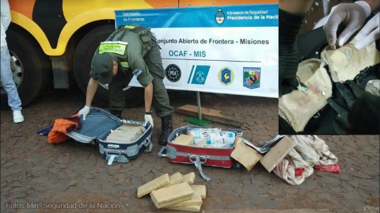Efectivos de la Gendarmería Nacional, institución que comanda Gerardo Otero, llevaron a cabo controles vehiculares sobre la Ruta Nacional N° 12, altura Gobernador Roca.Allí, el personal de la fuerza interceptó un ómnibus que provenía desde Iguazú y se dirigía a La Plata y, al requisar la bodega donde se traslada el equipaje, detectaron dos valijas con llamativo sobrepeso y fuerte olor a citronela, que generalmente se usa para despistar a los perros anti narcóticos.Con la presencia de los testigos, los gendarmes abrieron los bolsos y hallaron 21,708 kilogramos de marihuana repartida en 23 paquetes tipo ladrillos. Inmediatamente, se controló la indumentaria y el resto de pertenencias de los involucrados y, la ropa interior de uno de ellos, tenía impregnada un líquido que, ante las pruebas correspondientes, dio positivo a cocaína.Bajo las órdenes del Juzgado Federal de Oberá, se detuvo a los imputados y se secuestró la totalidad del estupefaciente.